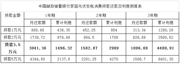 3,家庭光伏发电信用消费贷款的最低利率为贷款同档次基准利率上浮20%。该利率视贷款期限的不同而不同,贷款期限在一年以内(含一年)的为固定利率,合同有效期内如遇基准利率调整,仍按贷款合同约定的利率执行;一年以上的贷款采取浮动利率,次年初调整。贷款期限最短为6个月,最长为36个月,还款方式为等额本息还款法,即每月还款金额相同。贷款额度为单户最高5万元。