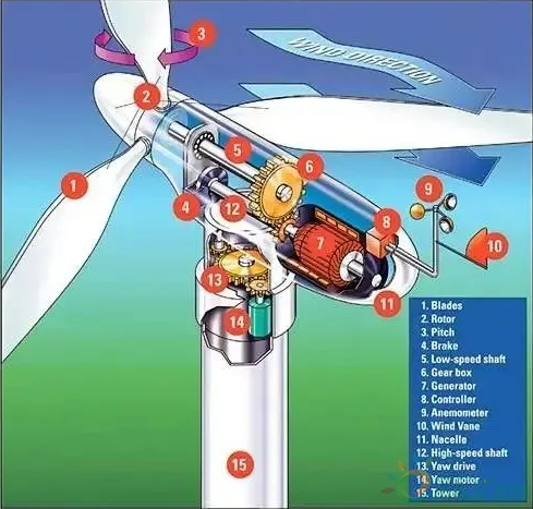 5.旋转系统(Yaw system),可以根据风向来调整风机的朝向。