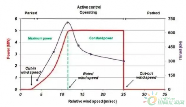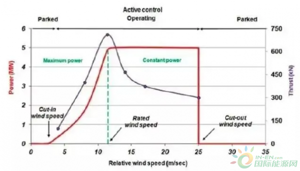 当风速达到切入风速时,风机开始发电,达到额定风速时,即可达到风机的额定功率,当风速增大到切出风速时,此时风机需停机,当然实际中是数据离散型的,非曲线。风机和桩的强度需满足极端风况下的安全要求(参见IEC等规范)。
