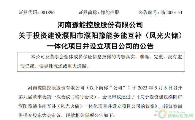 5月9日,河南豫能控股股份有限公司(以下简称“豫能控股”或“公司”)发布《关于投资建设濮阳市濮阳豫能多能互补(风光火储)一体化项目并设立项目公司的公告》。