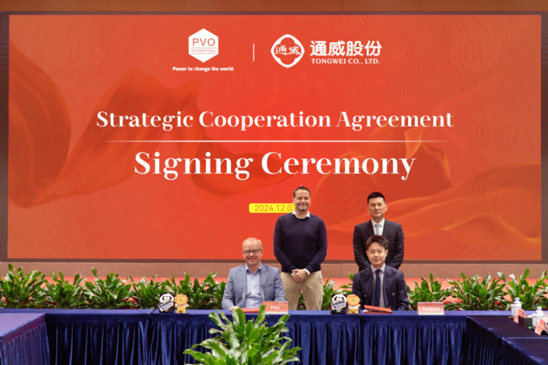 12月3日,PVO International B.V.(以下简称“PVO”)一行到访通威。期间,双方签署了合作备忘录(MOU),并达成高效光伏组件的三方项目供货协议。