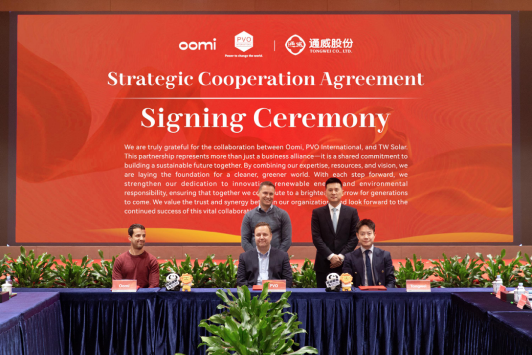 期间,通威、PVO与Oomi Solar三方达成高效光伏组件供货协议,进一步拓宽了合作边界。通威股份光伏商务部组件营销副总经理薛青松、PVO首席采购官Erwin Damen见证签约,PVO客户经理Jukka Vihko,Oomi Solar业务总监Arttu Raitala,通威股份光伏商务部组件营销亚太、欧洲及中东非区负责人陈方舟代表三方共同签署协议。