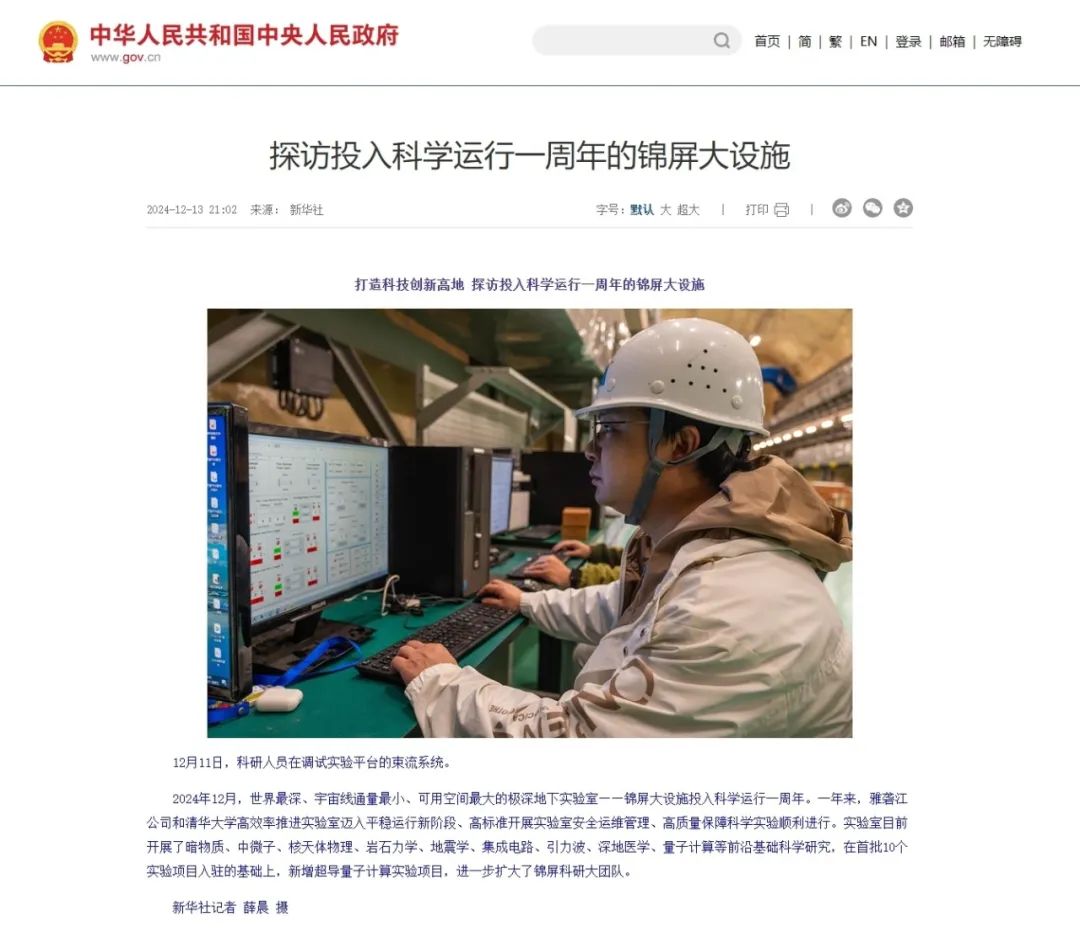 12月13日,中国政府网发布《打造科技创新高地 探访投入科学运行一周年的锦屏大设施》,通过一组图片展现了国投集团雅砻江公司和清华大学高效率推进实验室迈入平稳运行新阶段、高标准开展实验室安全运维管理、高质量保障科学实验顺利进行。