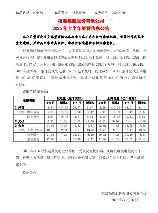7月26日,福能股份发布2025 年上半年经营信息公告。