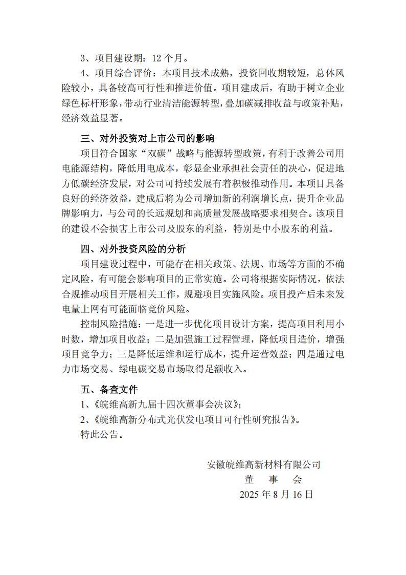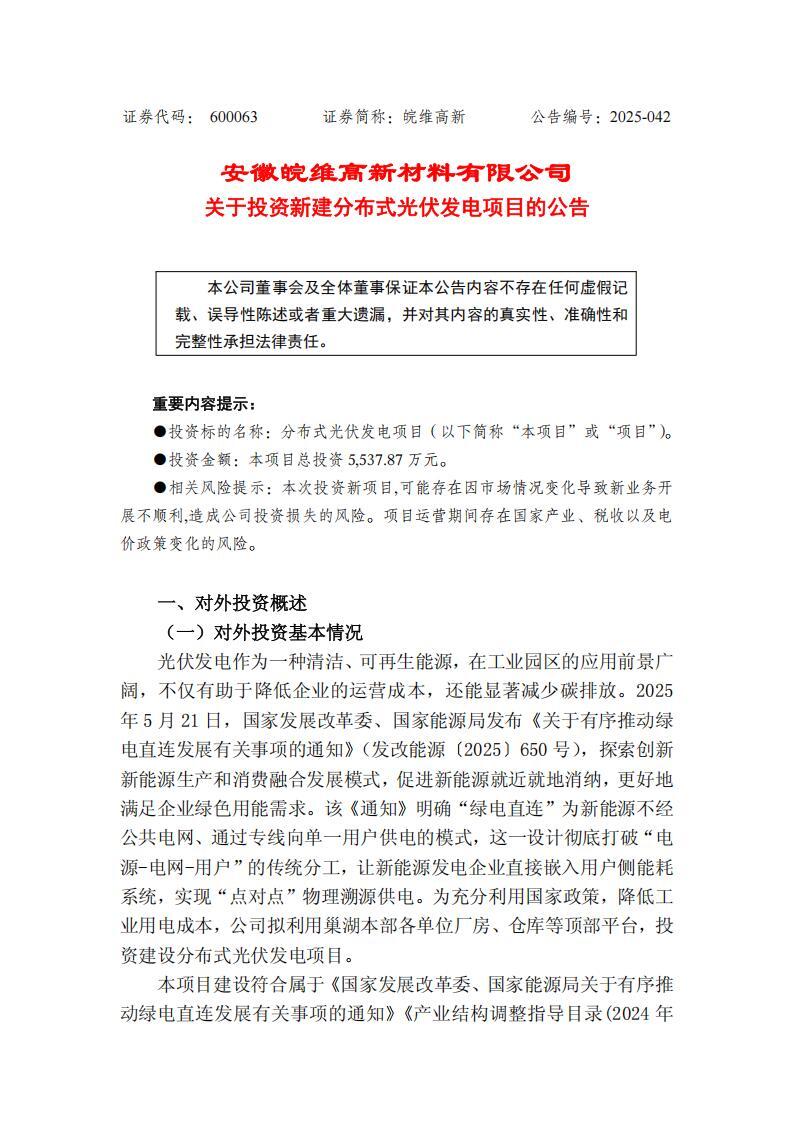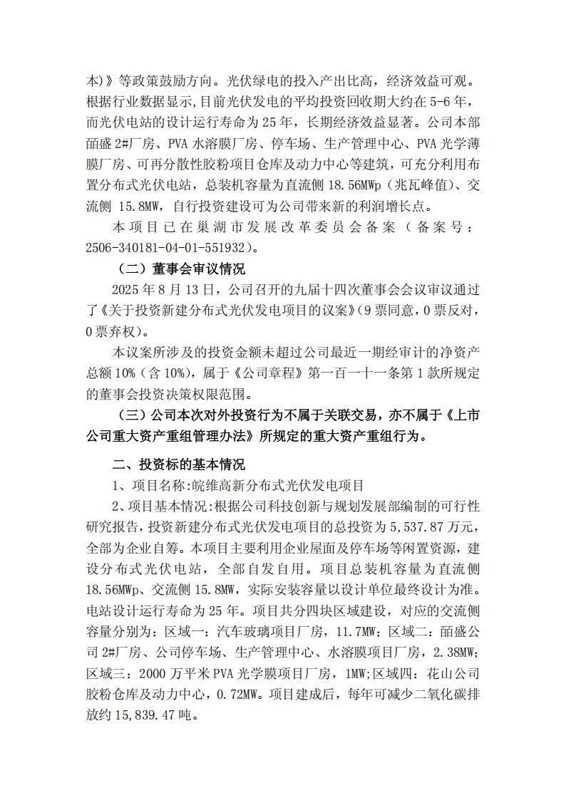 8月16日,皖维高新发布关于投资建设分布式光伏发电项目的公告。