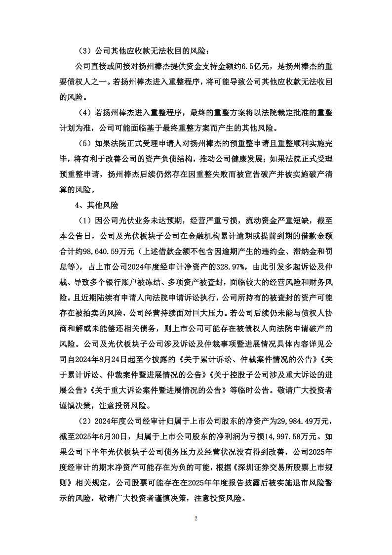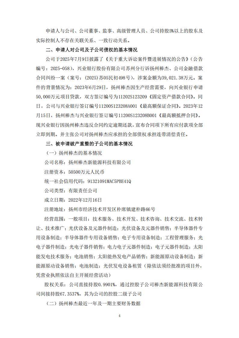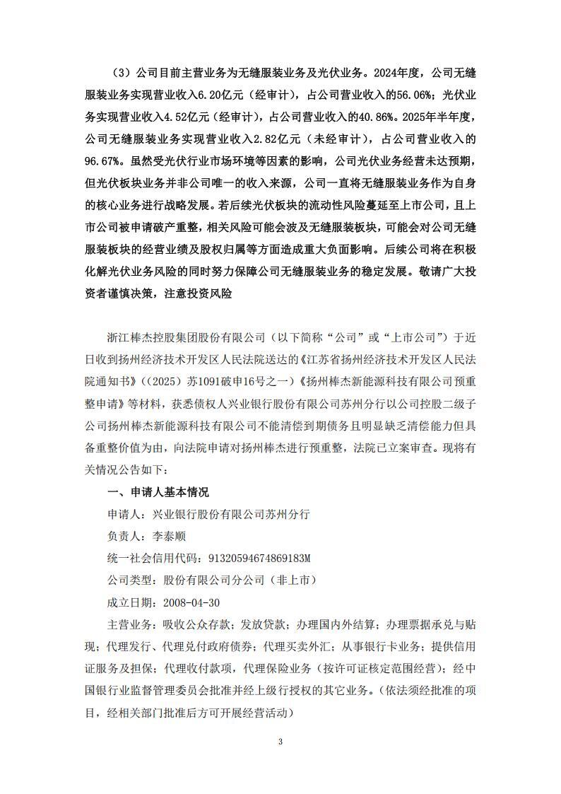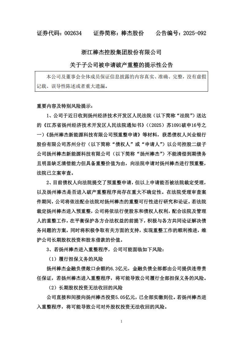 根据公告,近日,棒杰股份收到扬州经济技术开发区人民法院送达的《江苏省扬州经济技术开发区人民法院通知书》((2025)苏1091破申16号之一)《扬州棒杰新能源科技有限公司预重整申请》等材料,获悉债权人兴业银行股份有限公司苏州分行以棒杰股份控股二级子公司扬州棒杰新能源科技有限公司不能清偿到期债务且明显缺乏清偿能力但具备重整价值为由,向法院申请对扬州棒杰进行预重整,法院已立案审查。