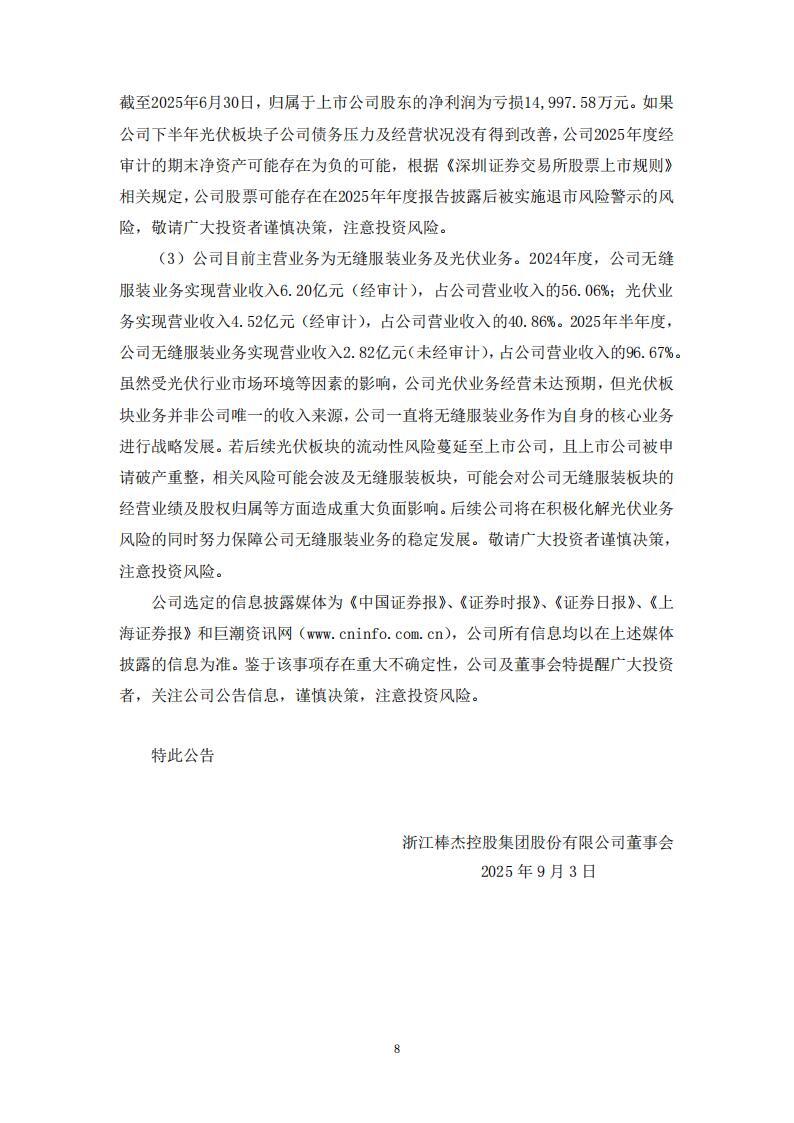 9月4日,棒杰股份发布关于子公司被申请破产重整的提示性公告。
