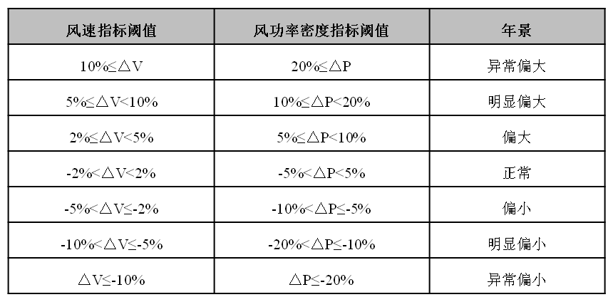 (1)风能资源年景采用风速距平百分率(△V)、风功率密度距平百分率(△P)作为评价指标,年景判断按附表1的标准划分: