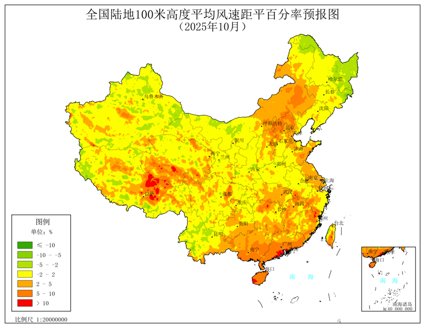 图1.2 2025年10月全国陆地100米高度平均风速距平百分率预报图