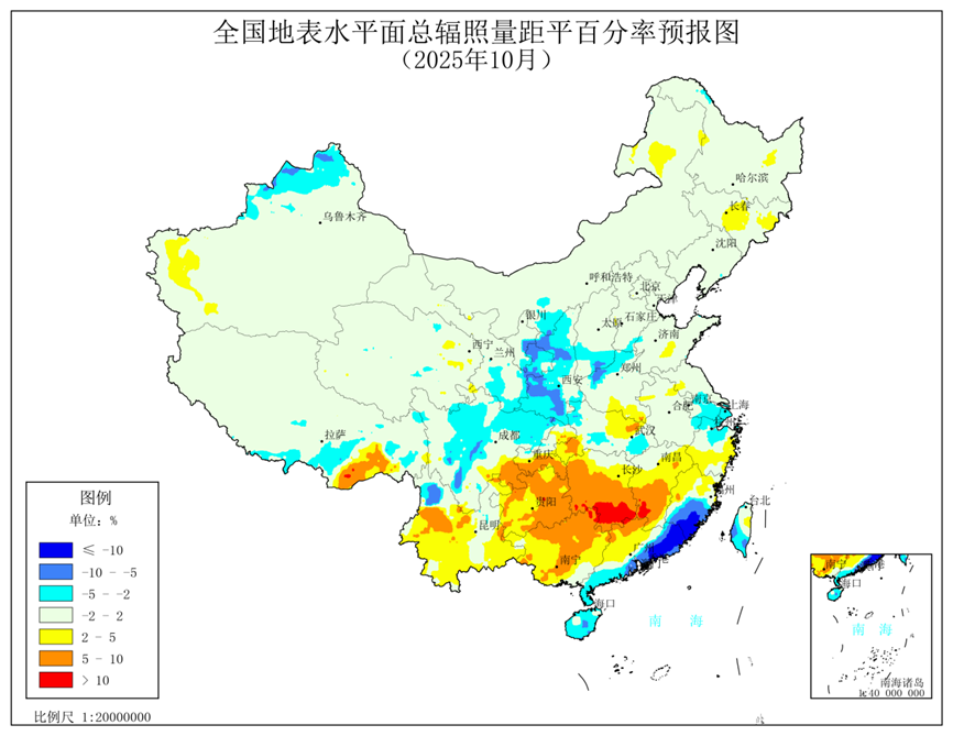 图2.2 2025年10月平均水平面总辐照量距平百分率预报