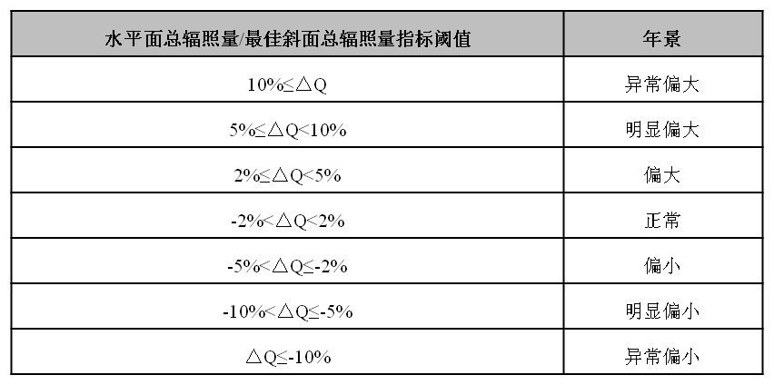 (2)太阳能资源年景采用水平面总辐照量距平百分率/最佳斜面总辐照量距平百分率(△Q)作为评价指标,年景判断按附表2的标准划分: