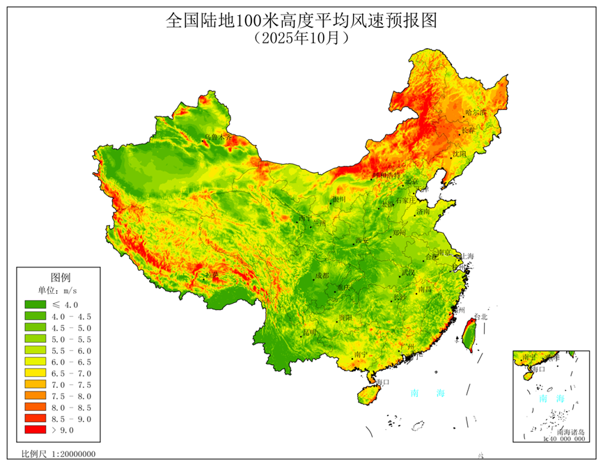 图1.1 2025年10月全国陆地100米高度平均风速预报图