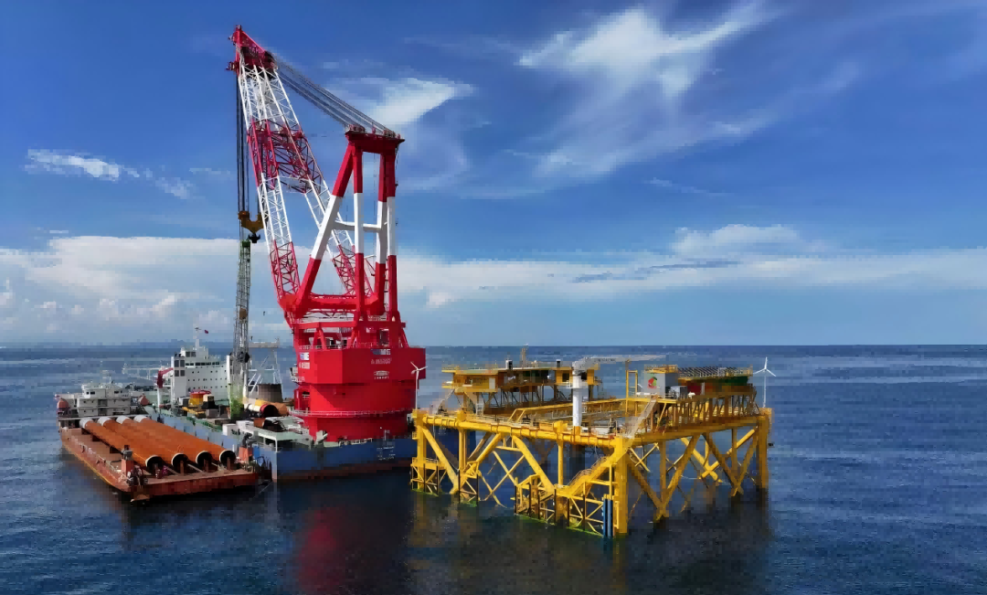 在面临场址水深涌急、施工窗口期短、施工船舶选型苛刻、吊装工况要求极高等诸多挑战,为确保施工顺利进行,国家电投集团广东公司联合国核电力院项目团队紧盯台风过境后黄金窗口期,严把进场船机、人员安全关,通过半潜驳船与浮吊船联合作业,气囊助浮完成网箱沉放,并完成后续钢管桩沉桩、灌浆等施工,将“龙宫号”安全平稳安装到指定位置。