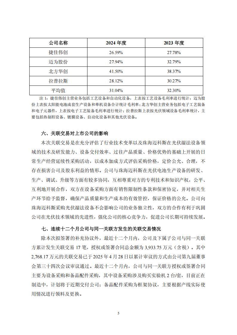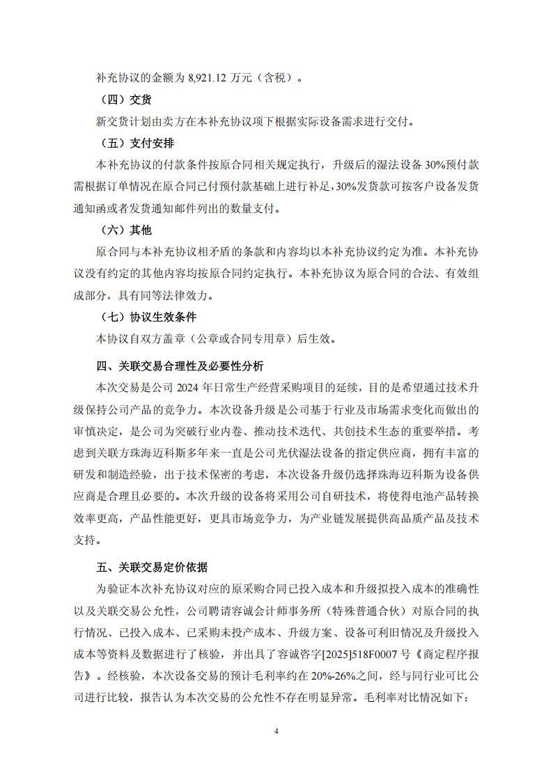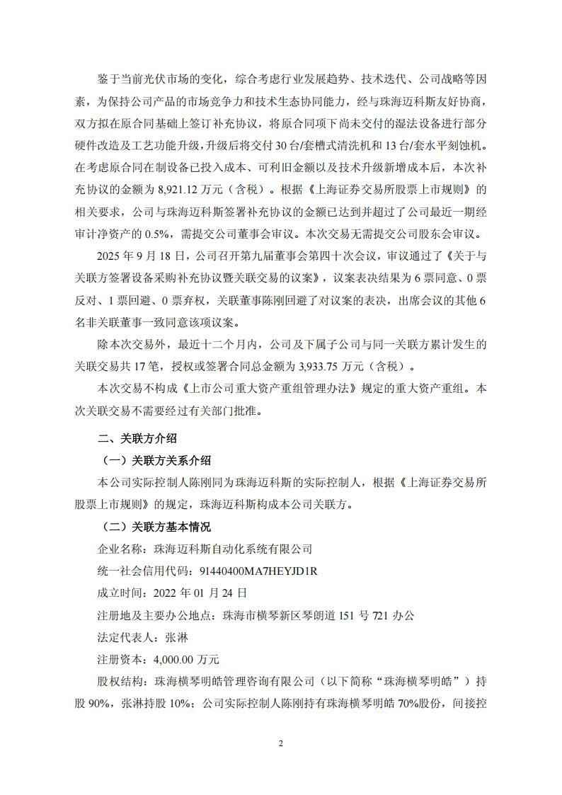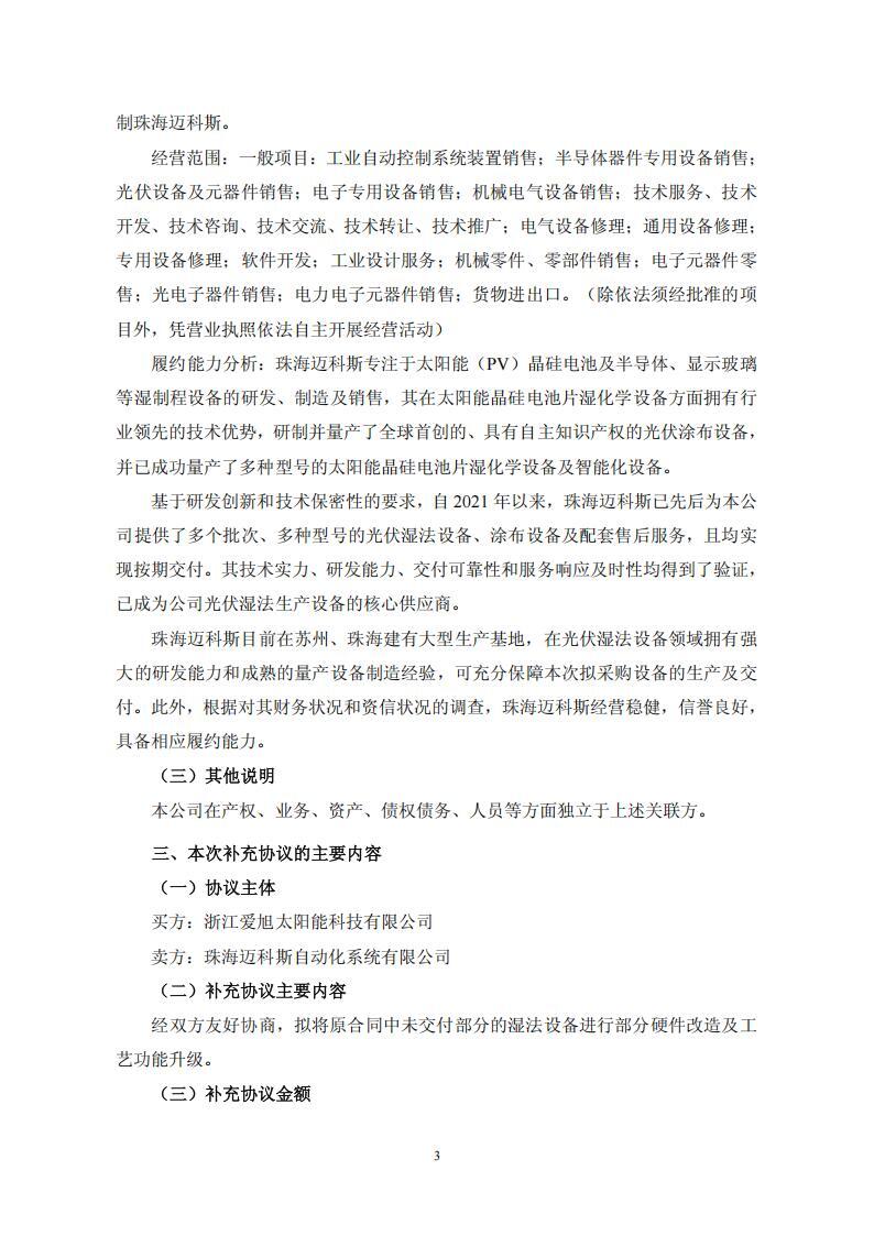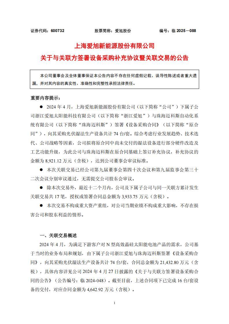 公告显示,2024 年 4 月,爱旭股份下属子公司浙江爱旭太阳能科技有限公司与珠海迈科斯自动化系统有限公司签署《设备采购合同》,向其采购光伏湿法生产设备共计 74 台/套。综合考虑行业发展趋势、技术迭代、公司战略等因素,爱旭股份拟将原合同中尚未交付的湿法设备进行部分硬件改造及工艺功能升级,为此爱旭股份与珠海迈科斯在原合同基础上签订补充协议,补充协议的金额为 8,921.12 万元(含税)。