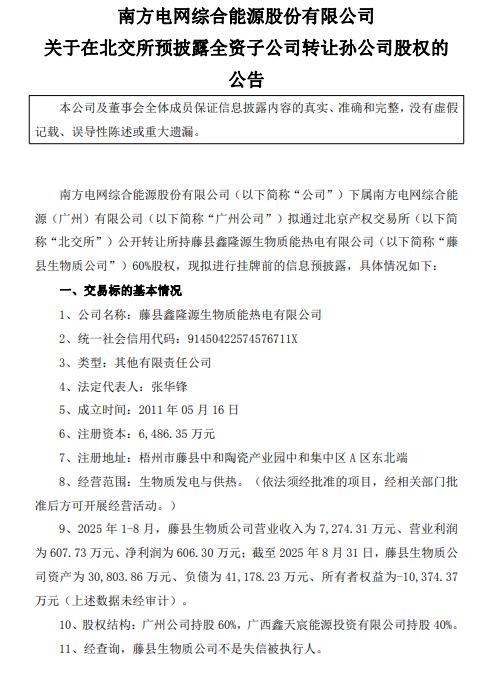 公告显示,南网能源下属南方电网综合能源(广州)有限公司(简称“广州公司”)拟通过北京产权交易所公开转让所持藤县鑫隆源生物质能热电有限公司(以下简称“藤县生物质公司”)60%股权。