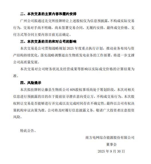 9月30日,南网能源发布关于在北交所预披露全资子公司转让孙公司股权的公告。