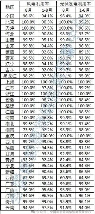 8月风电利用率平均为96.6%,1-8月平均为94.1%。其中,湖南、青海、新疆、西藏、海南、云南利用率不足95%。
