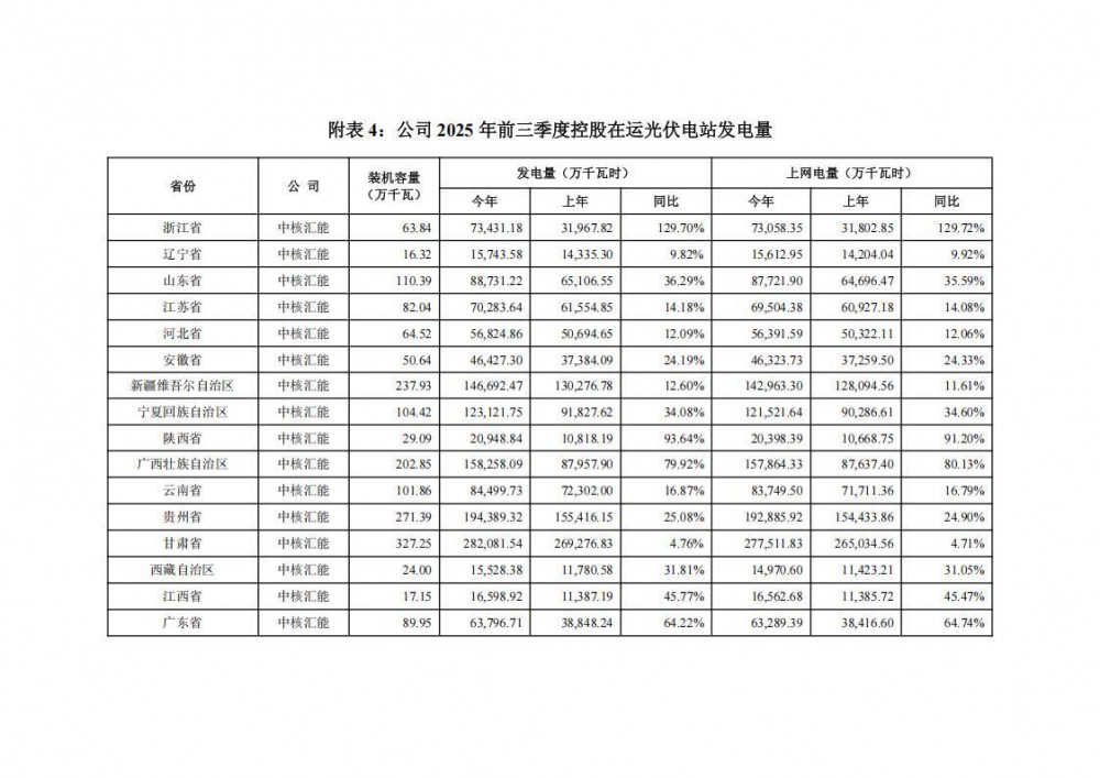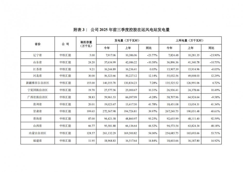 2025 年前三季度,中国核电控股新能源机组发电量累计为333.56 亿千瓦时,同比增长 34.77%;上网电量累计为 328.12 亿千瓦时,同比增长34.82%。其中:风力发电量 143.62 亿千瓦时,同比增长 29.28%,机组平均利用小时数约为 1,416.44 小时;光伏发电量 189.95 亿千瓦时,同比增长39.25%,机组平均利用小时数约为 875.91 小时。