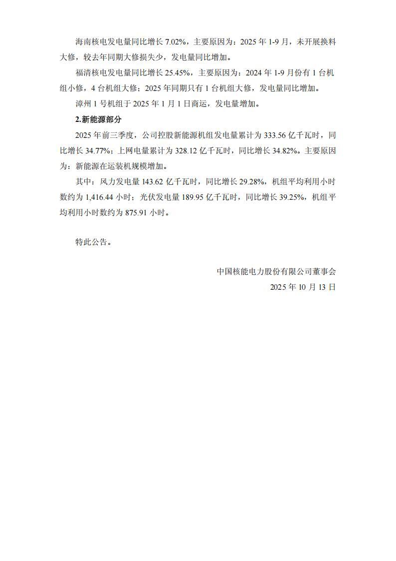 10月13日,中国核电发布2025 年前三季度发电量完成情况公告。