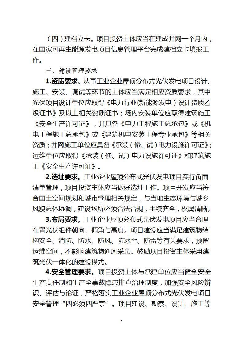 文件指出,工业企业屋顶分布式光伏发电项目利用新建建筑物及其附属场所的,鼓励在建筑物规划设计、施工建设等阶段统筹考虑安装需求,一并办理规划许可等手续;利用既有建筑物及其附属场所的,可按照简约高效的原则,在符合建设要求的条件下免除用地预审与规划选址、规划许可、节能评估等手续。项目建设要严格按图施工,建筑为坡屋面结构时,光伏组件需与建筑屋顶平行且有机结合,不得超出屋面外沿,光伏系统最高点不得高过屋脊,组件表面与屋面垂直高度不应超过0.3米;建筑为平屋面结构时,光伏组件不能超过女儿墙高度,无女儿墙的,光伏组件安装最高高度与屋面距离一般不超过1.5米。光伏板下方四周不得进行任何形式的围合,一律不得堆放可燃物品。