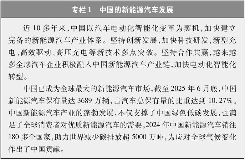 低碳交通运输工具加快普及。中国加速推广新能源汽车,实现了全球速度最快、规模最大的新能源汽车推广应用。2025年1-9月,新能源乘用车国内市场渗透率达到52.2%,在主要经济体中位居第一。中国铁路电气化水平世界领先,2024年铁路电化率达76.2%。推动船舶、航空器采用清洁动力,2024年民航运输机队燃效较2005年基线水平下降20.5%。深入推进重点区域、重点航线、重点船舶靠港使用岸电,主要港口的重点专业化泊位岸电覆盖率超过90%。中国民航机场场内电动化水平全球领先,截至2025年7月底,民航机场场内电动车辆占比达到32%。