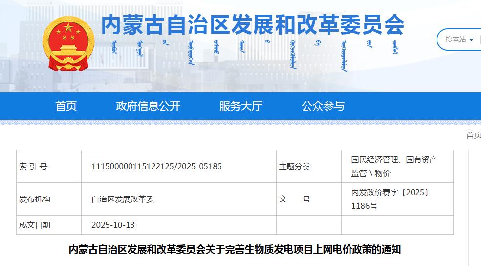 日前,内蒙古自治区发展和改革委员会发布关于完善生物质发电项目上网电价政策的通知。