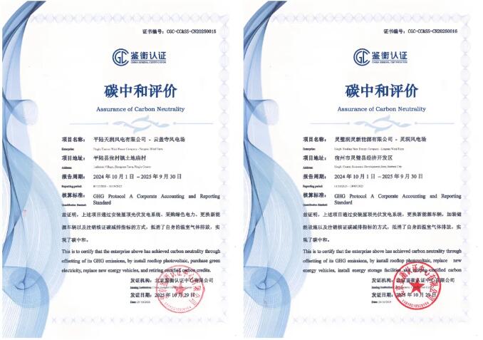 鉴衡认证中心依据国际权威温室气体核算标准GHG Protocol,对云盖寺风电场与灵润风电场运营边界内(范围1、范围2)的温室气体排放情况开展全面核查,确认两风电场已实现“碳中和”,最终为两座风电场颁发《碳中和评价》证书。
