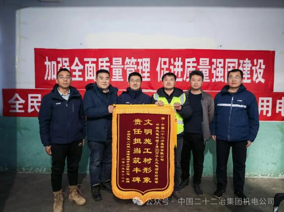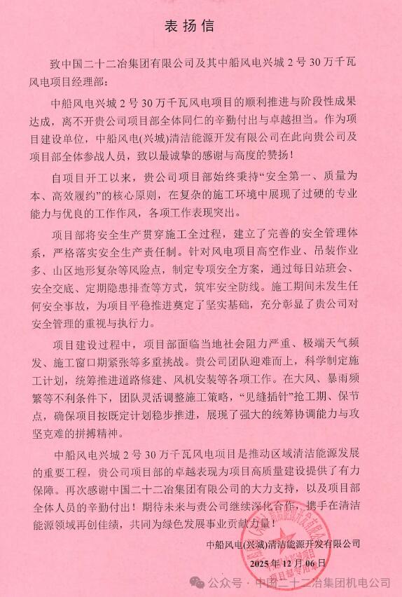 基于其在项目建设全周期的卓越表现,甲方建设单位特向中国二十二冶集团有限公司及其中船风电兴城2号30万千瓦风电项目经理部赠送锦旗并合影留念。