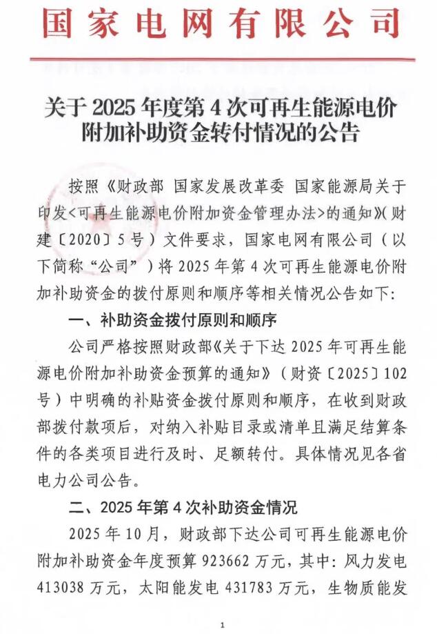根据公告,2025年10月,财政部下达公司可再生能源电价附加补助资金年度预算923662万元,其中:风力发电413038万元,太阳能发电431783万元,生物质能发