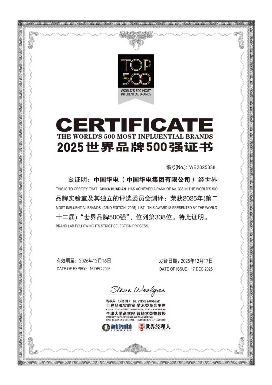 12月17日,世界品牌实验室(World Brand Lab)在香港举行发布会,发布2025年度(第二十二届)世界品牌500强排行榜。中国华电位列第338位,较去年大幅上升27位,连续三年蝉联这一极具全球影响力的品牌荣誉,彰显了能源央企在全球品牌版图中的强劲成长势头。