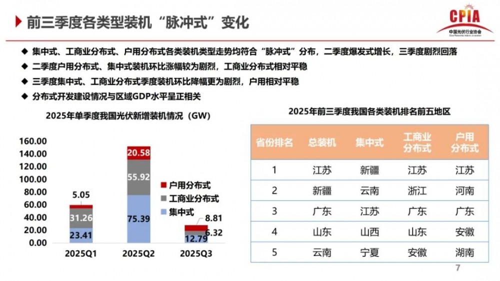 集中式、工商业分布式、户用分布式各类装机类型走势均符合"脉冲式"分布,二季度爆发式增长,三季度剧烈回落。