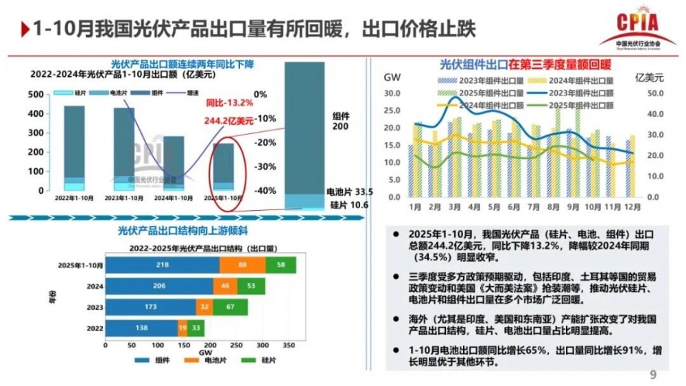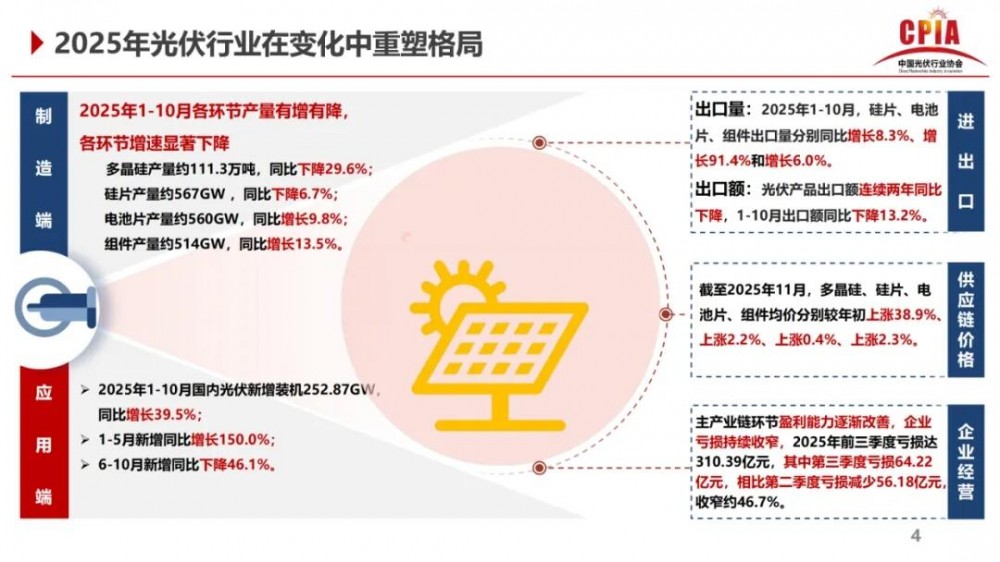 2025年1-10月,多晶硅产量约111.3万吨,硅片产量约567GW,电池片产量约560GW,光伏组件产量约514GW。