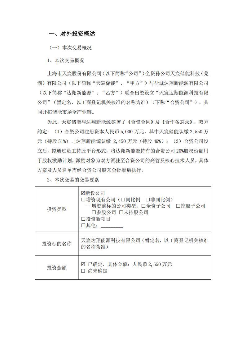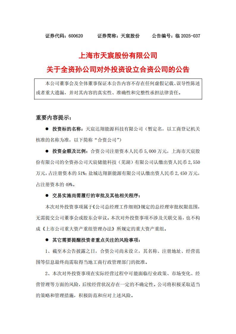 公告显示,上海市天宸股份有限公司全资孙公司天宸储能科技(芜湖)有限公司(简称“天宸储能”)与盐城达翔新能源有限公司(简称“达翔新能源”、“乙方”)联合出资设立“天宸达翔能源科技有限公司”(暂定名,以工商登记机关核准的名称为准),共同开拓储能市场全产业链。