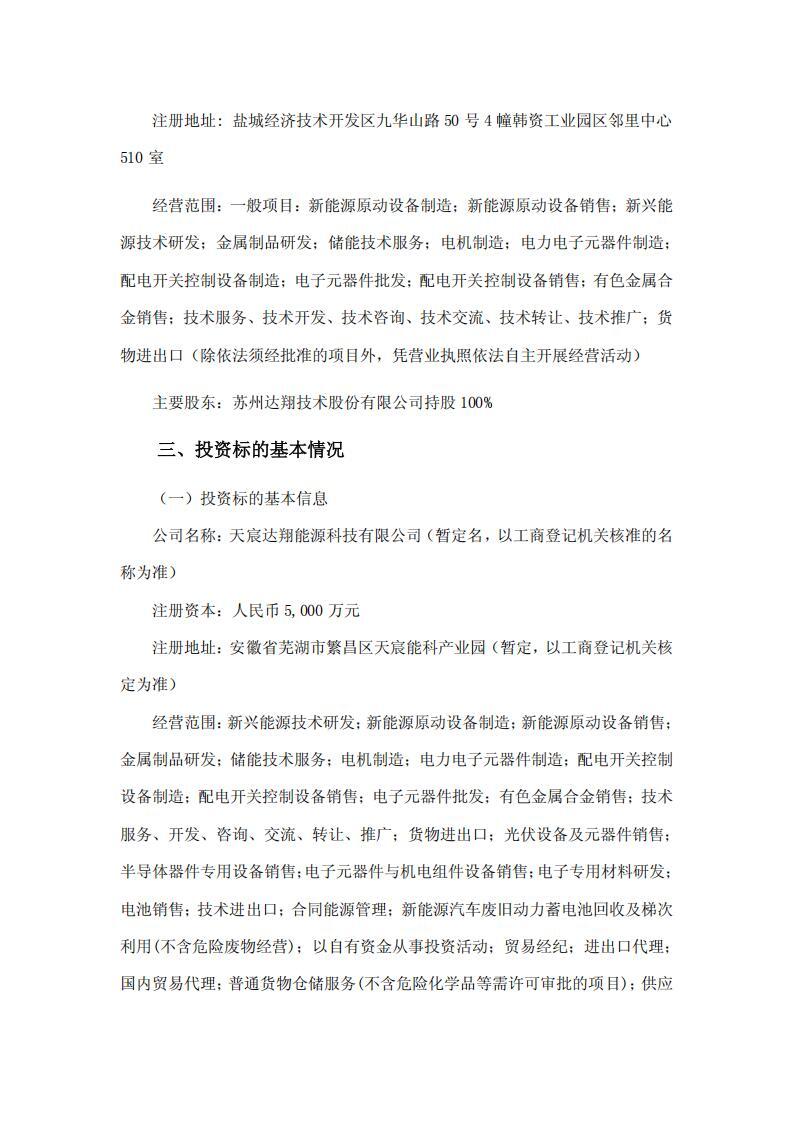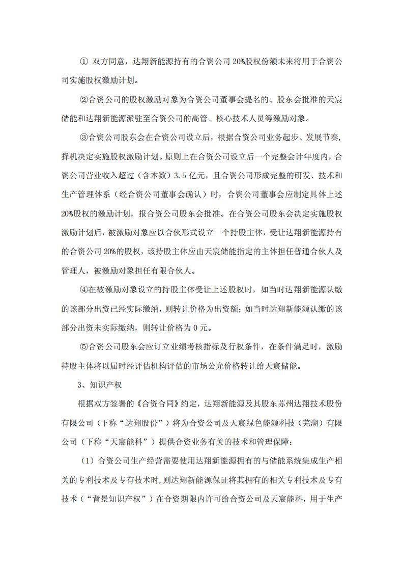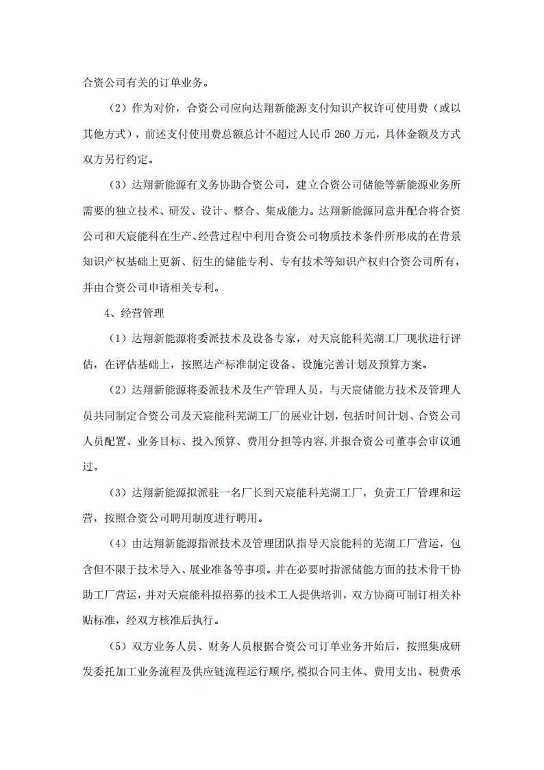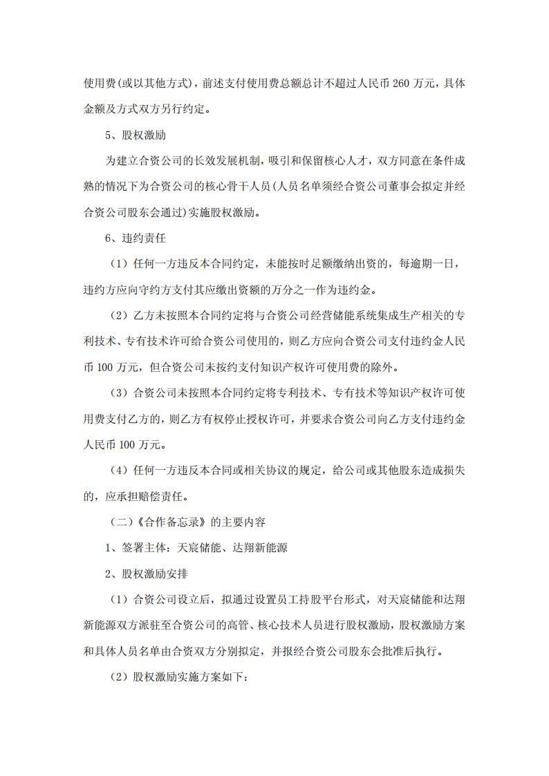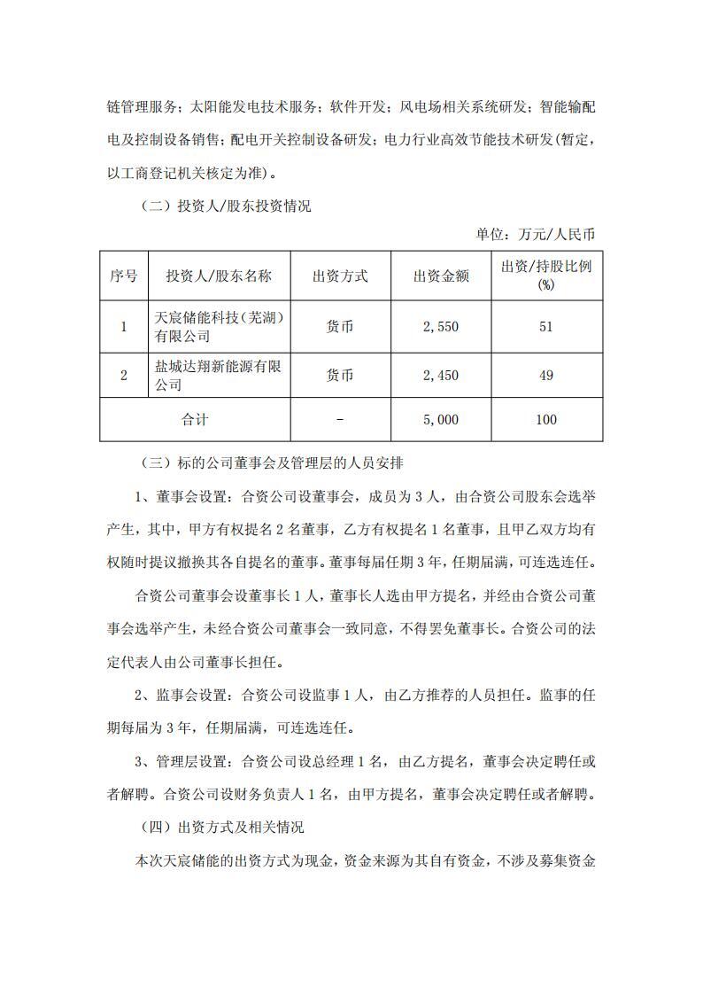为此,天宸储能与达翔新能源签署了《合资合同》及《合作备忘录》,双方约定:合资公司注册资本人民币 5,000 万元,其中天宸储能认缴 2,550 万元(持股 51%),达翔新能源认缴 2,450 万元(持股 49%)。