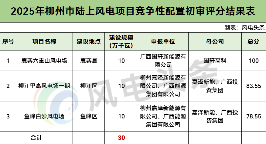 柳州市2025年陆上风电项目竞争性配置评分结果显示,共有3个风电项目,总规模30万千瓦。