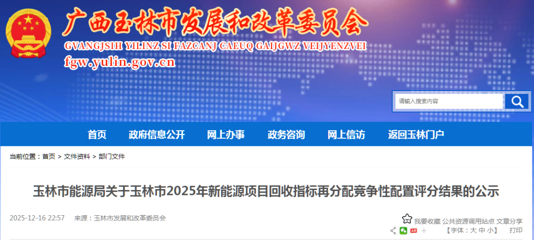 玉林市能源局关于玉林市2025年新能源项目回收指标再分配竞争性配置评分结果的公示
