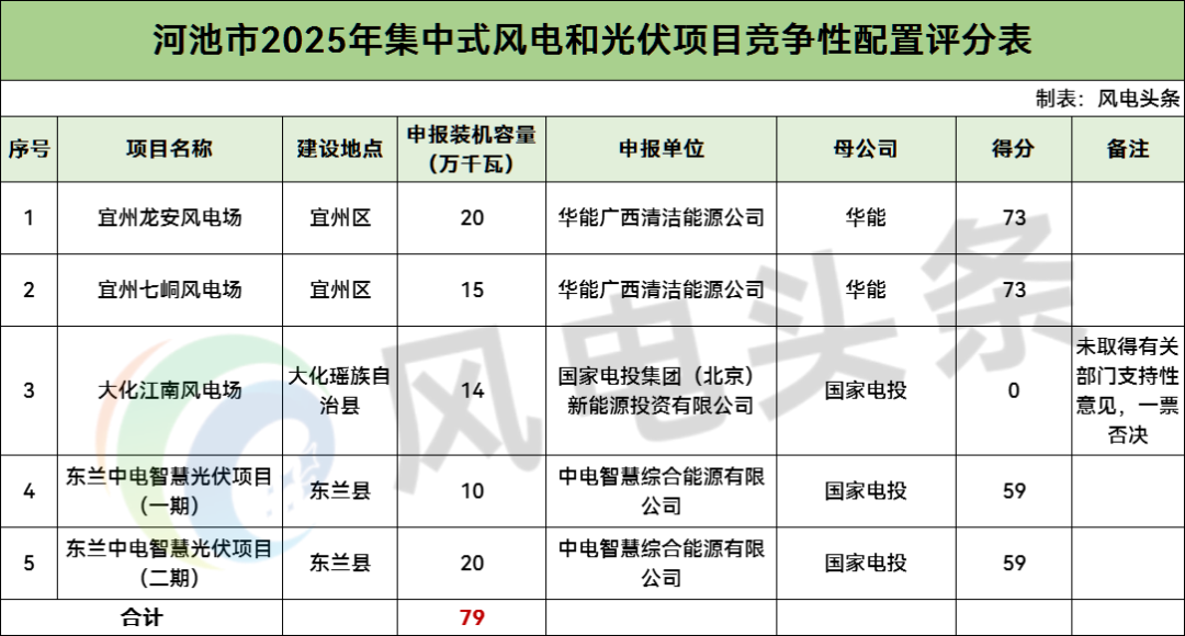 河池市2025年陆上风电项目竞争性配置评分结果显示,共有3个风电项目,总规模49万千瓦;2个光伏项目,总规模30万千瓦。