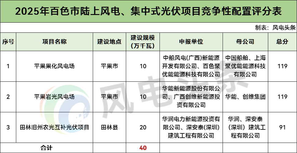 百色市2025年陆上风电、集中式光伏项目竞争性配置评分结果显示,共有2个风电项目,总规模20万千瓦;1个光伏项目,规模20万千瓦。