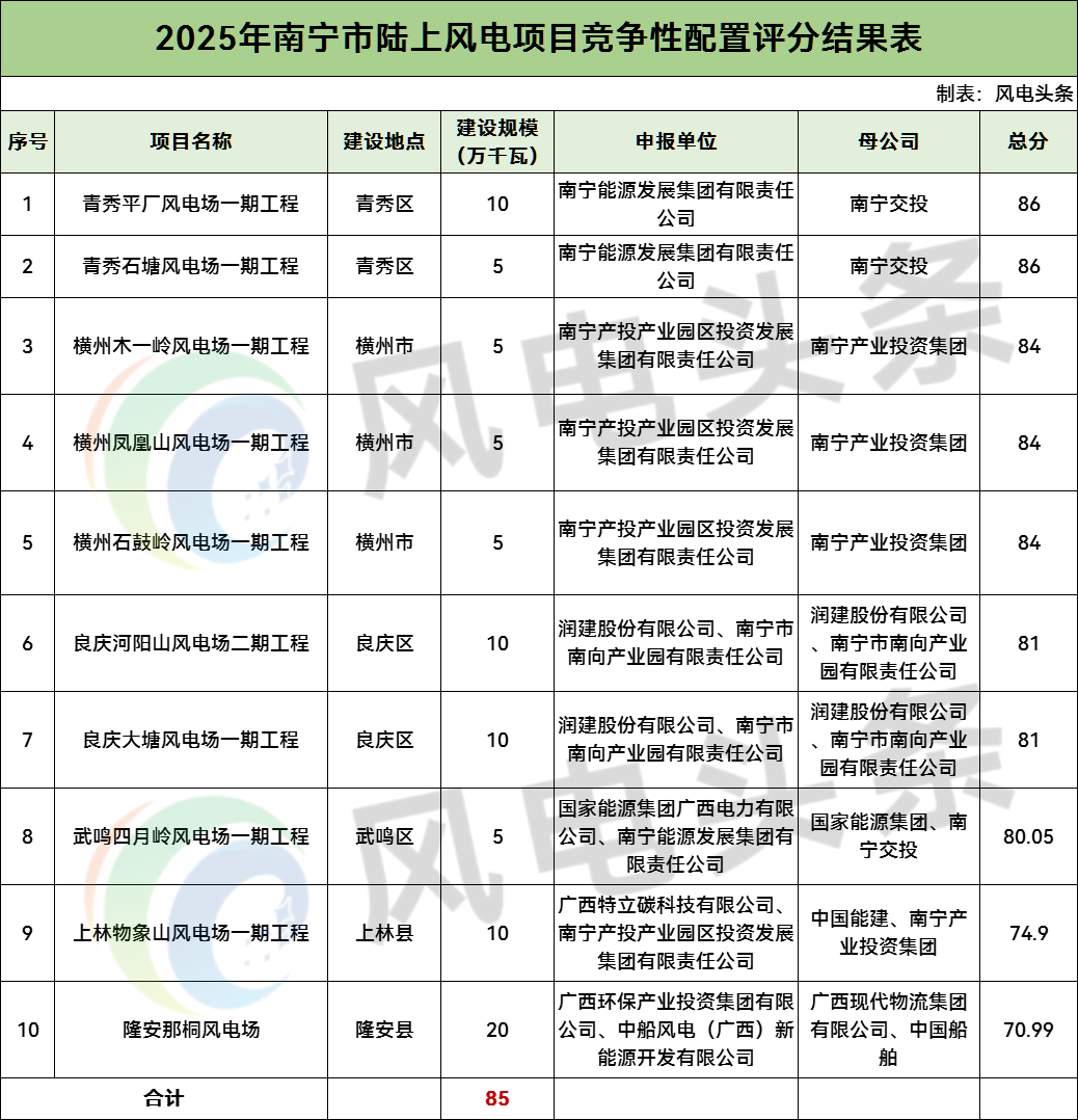 南宁市2025年陆上风电项目竞争性配置评分结果显示,共有10个风电项目,总规模85万千瓦。