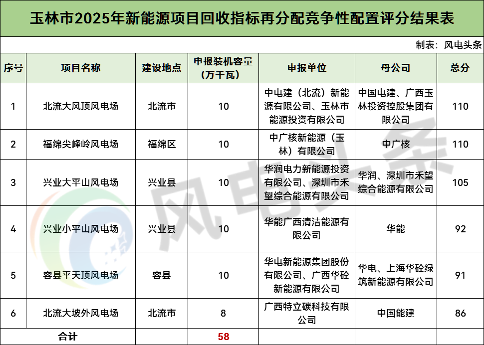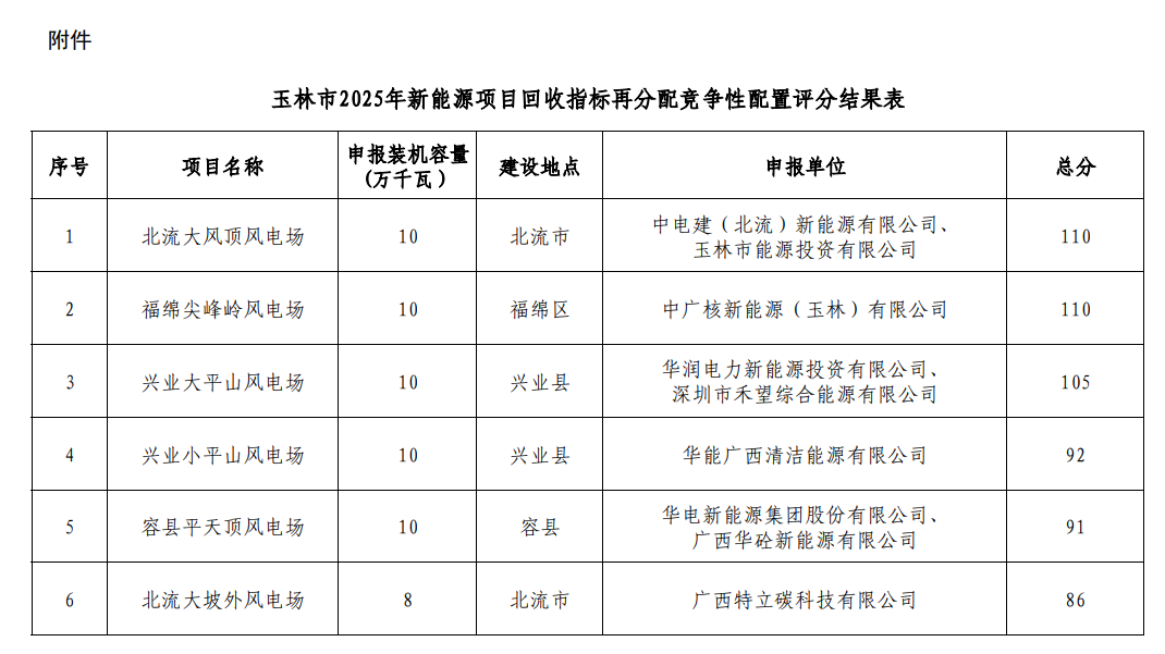 玉林市2025年新能源项目回收指标再分配竞争性配置评分结果显示,共有6个风电项目,总规模58万千瓦。