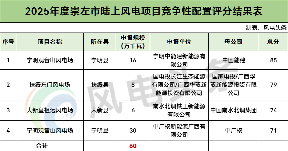 崇左市2025年陆上风电项目竞争性配置评分结果显示,共有4个风电项目,总规模60万千瓦。