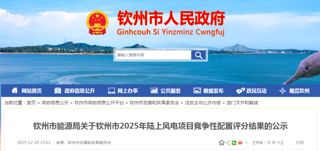 钦州市能源局关于钦州市2025年陆上风电项目竞争性配置评分结果的公示