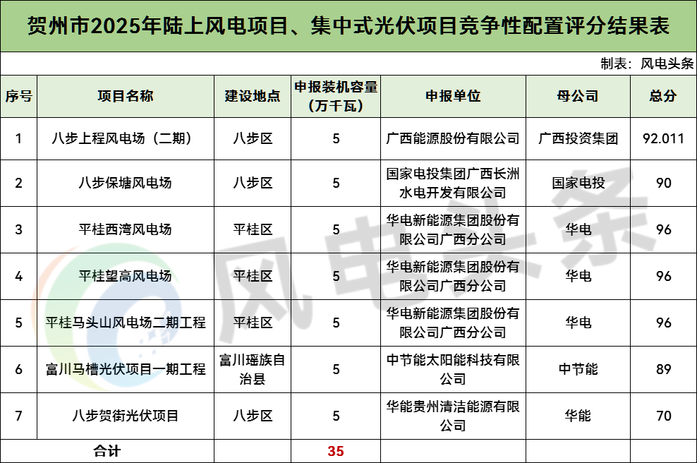 贺州市2025年陆上风电项目、集中式光伏项目竞争性配置评分结果显示,共有5个风电项目,总规模25万千瓦;2个光伏项目,总规模10万千瓦。