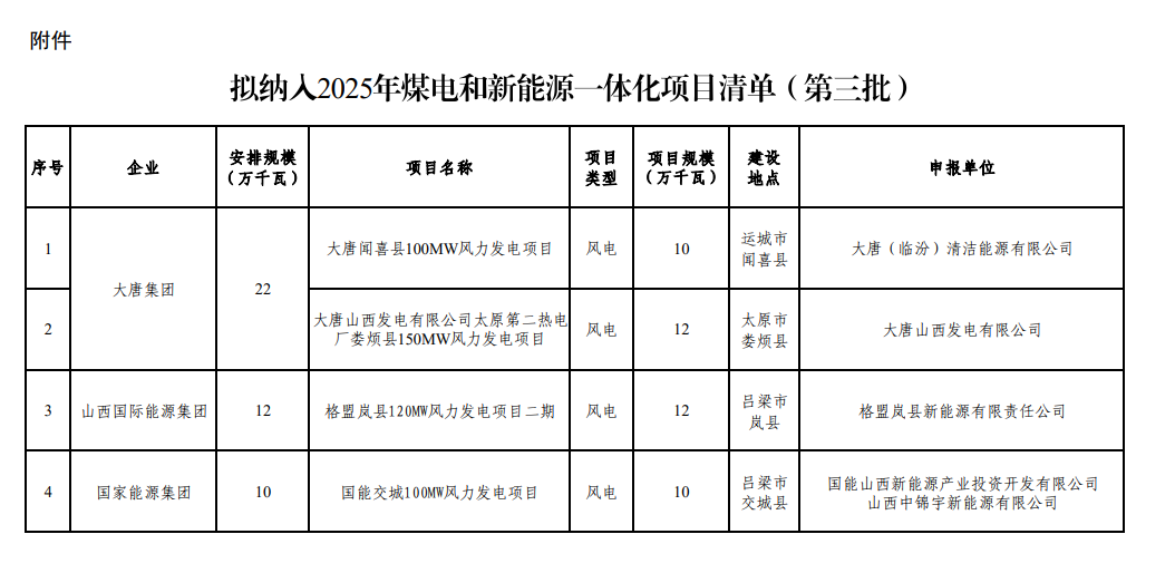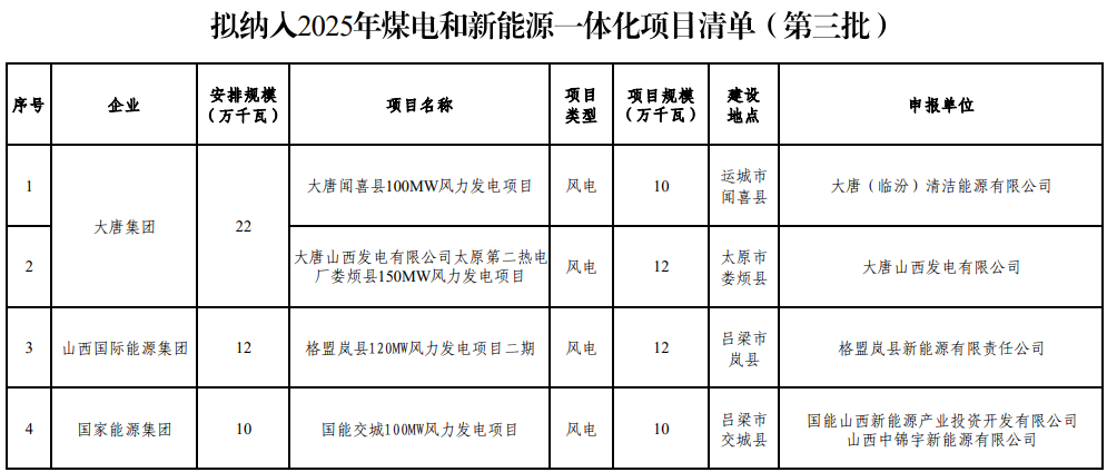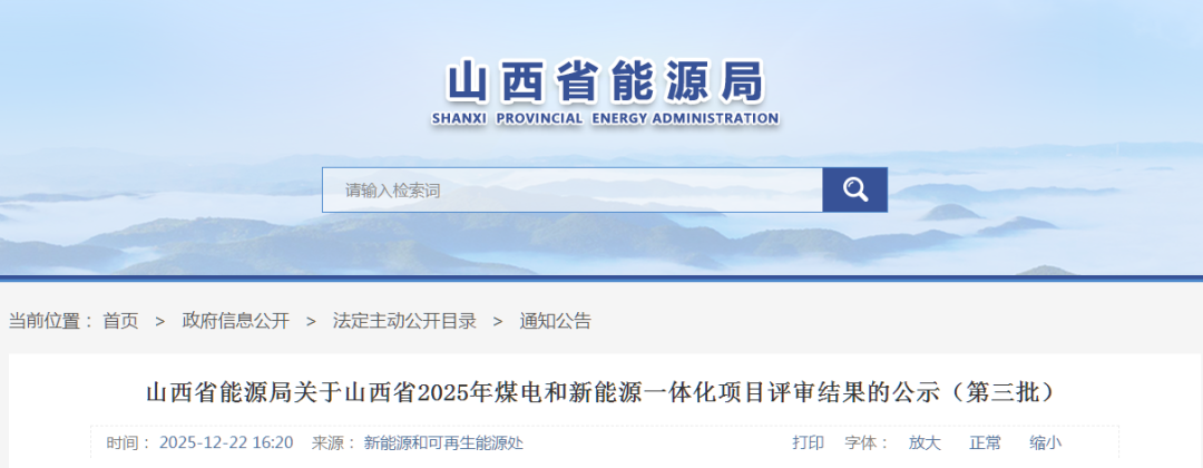 12月22日,山西省能源局发布关于山西省2025年煤电和新能源一体化项目评审结果的公示(第三批)。