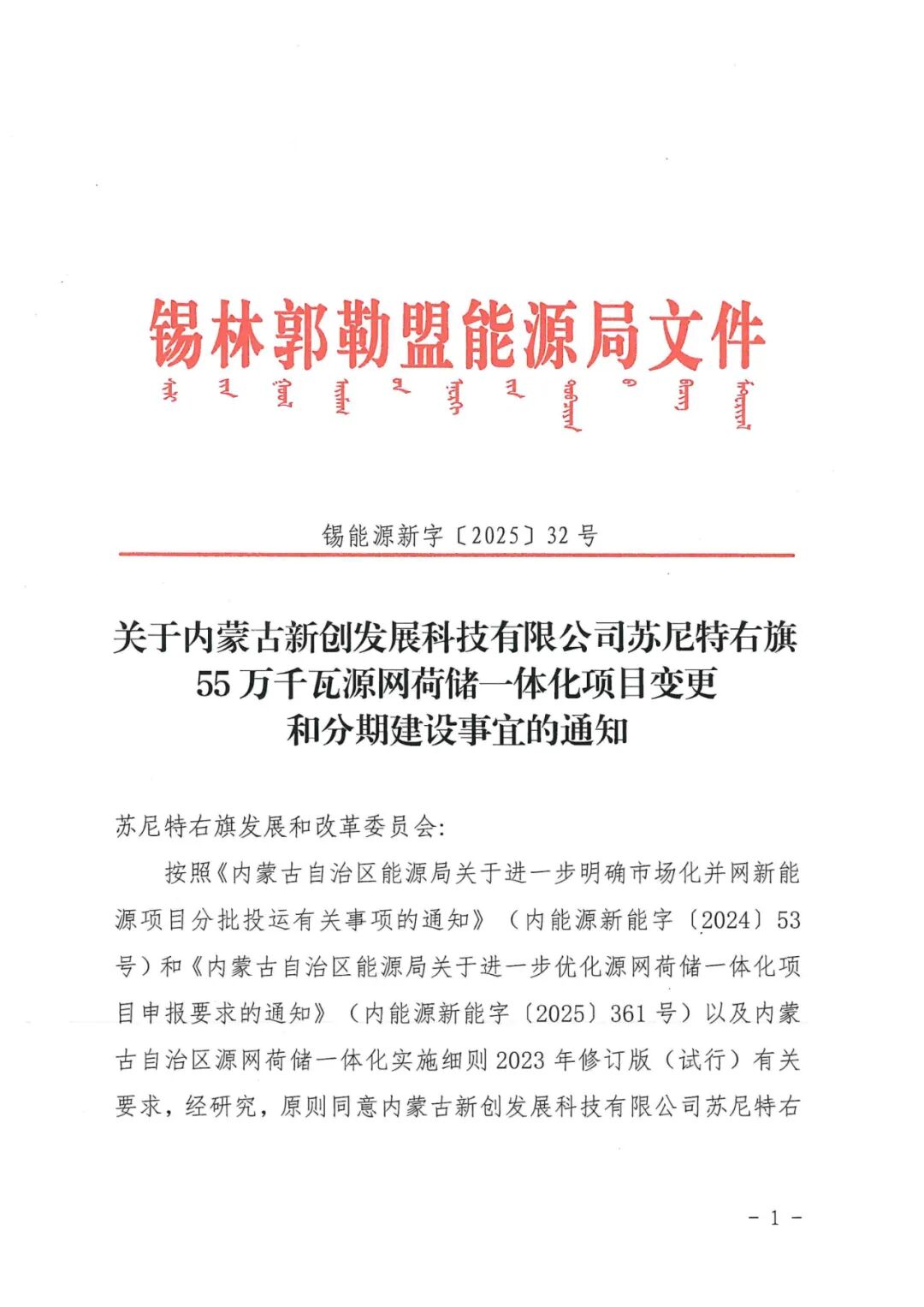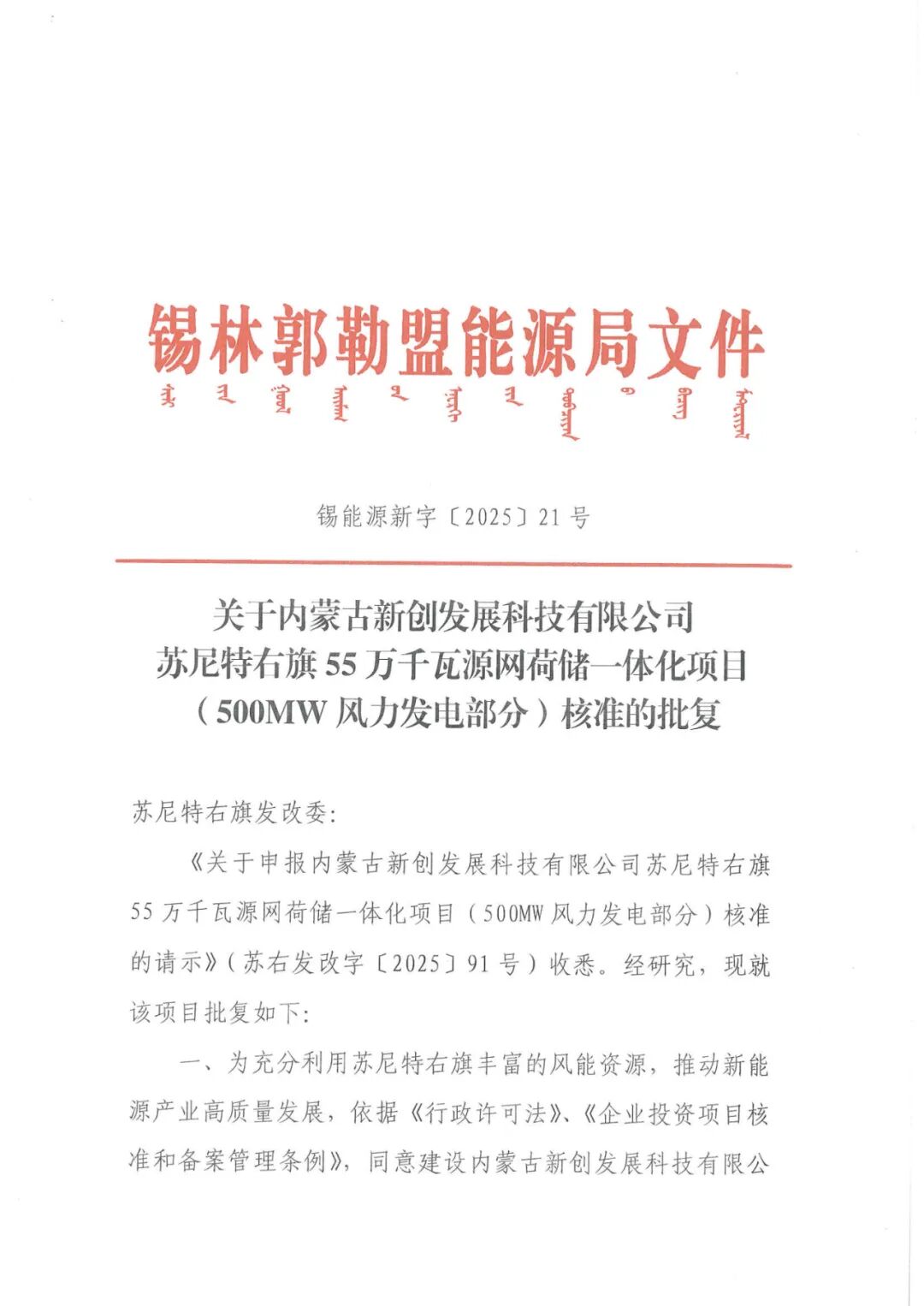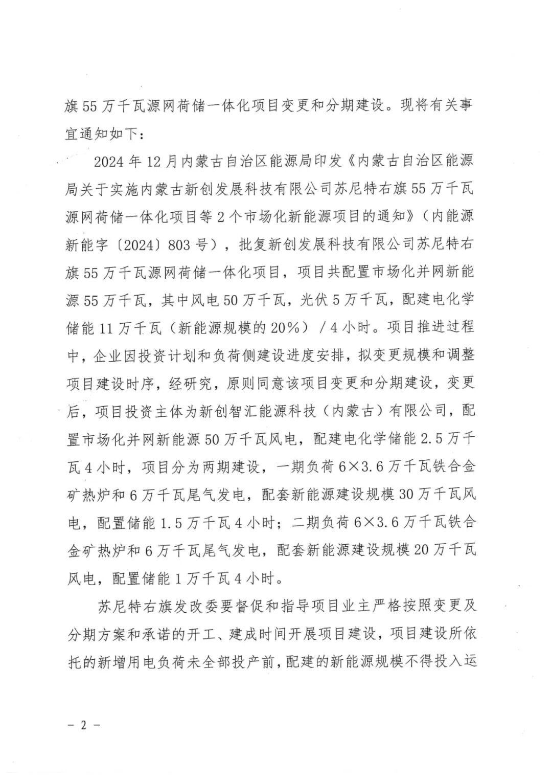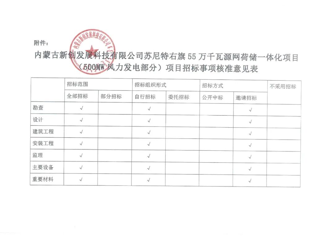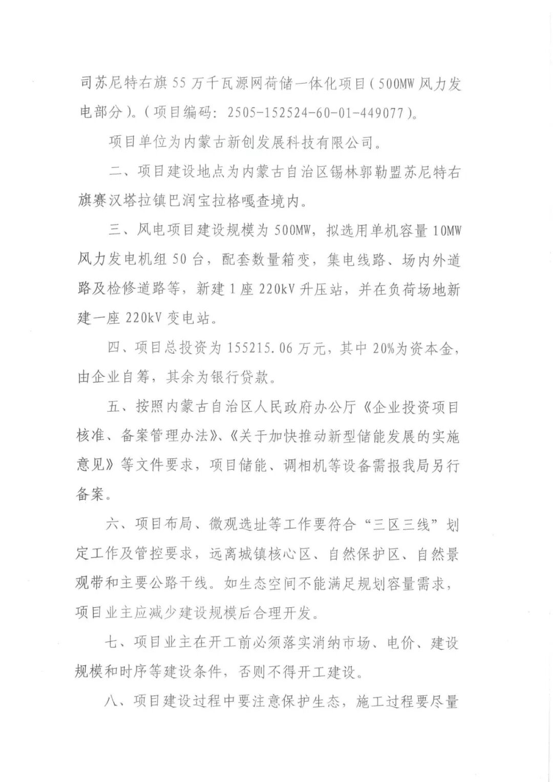内蒙古新创发展科技有限公司苏尼特右旗55万千瓦源网荷储一体化项目(500MW风力发电部分)位于内蒙古自治区锡林郭勒盟苏尼特右旗赛汉塔拉镇巴润宝拉格嘎查境内,项目投资主体为新创智汇能源科技(内蒙古)有限公司,风电项目建设规模为500MW,拟选用单机容量10MW风力发电机组50台,配套数量箱变,集电线路、场内外道路及检修道路等,新建1座220kV升压站,并在负荷场地新建一座220kV变电站。项目总投资为155215.06万元。