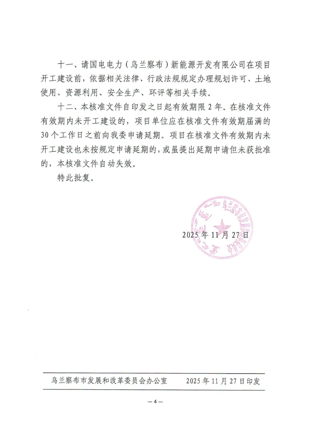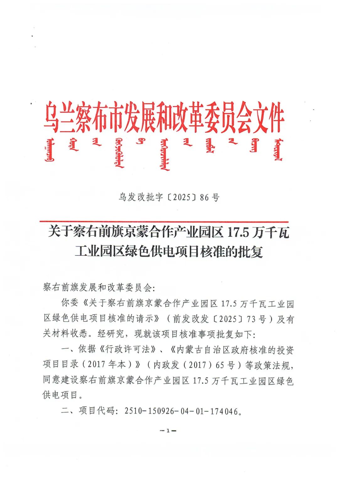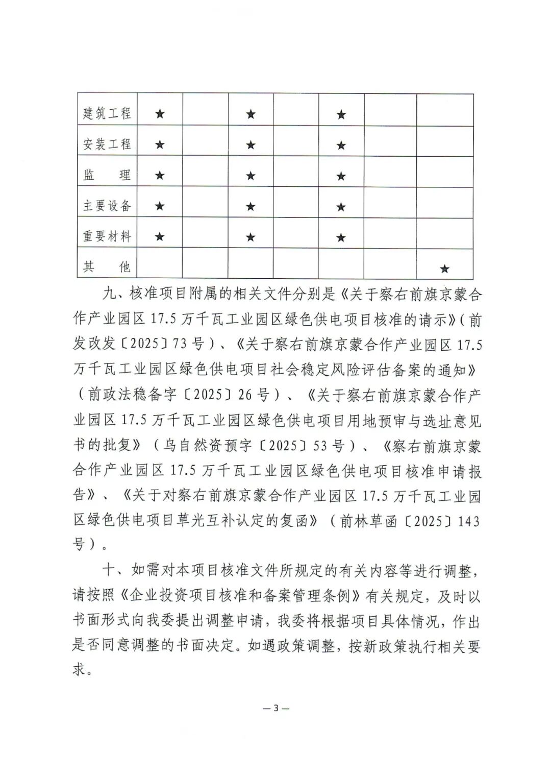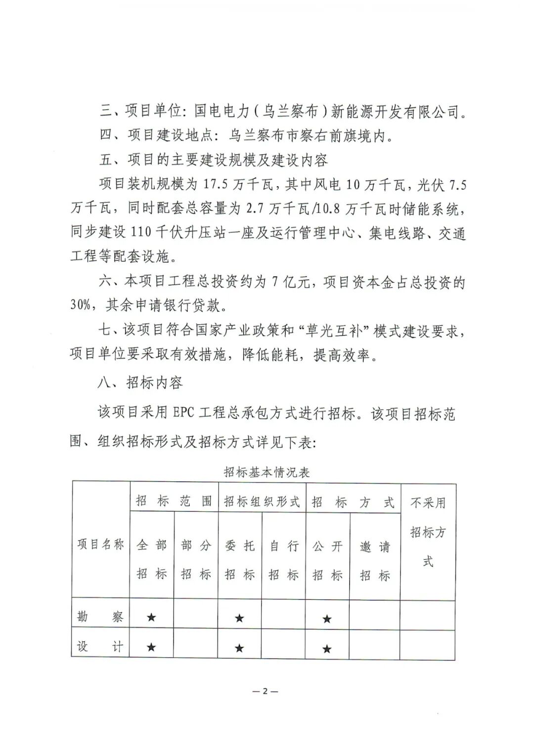 察右前旗京蒙合作产业园区17.5万千瓦工业园区绿色供电项目位于乌兰察布市察右前旗境内,项目单位为国电电力(乌兰察布)新能源开发有限公司。项目装机规模为17.5万千瓦,其中风电10万千瓦,光伏7.5万千瓦,同时配套总容量为2.7万千瓦/10.8万千瓦时储能系统,同步建设110千伏升压站一座及运行管理中心、集电线路、交通工程等配套设施。