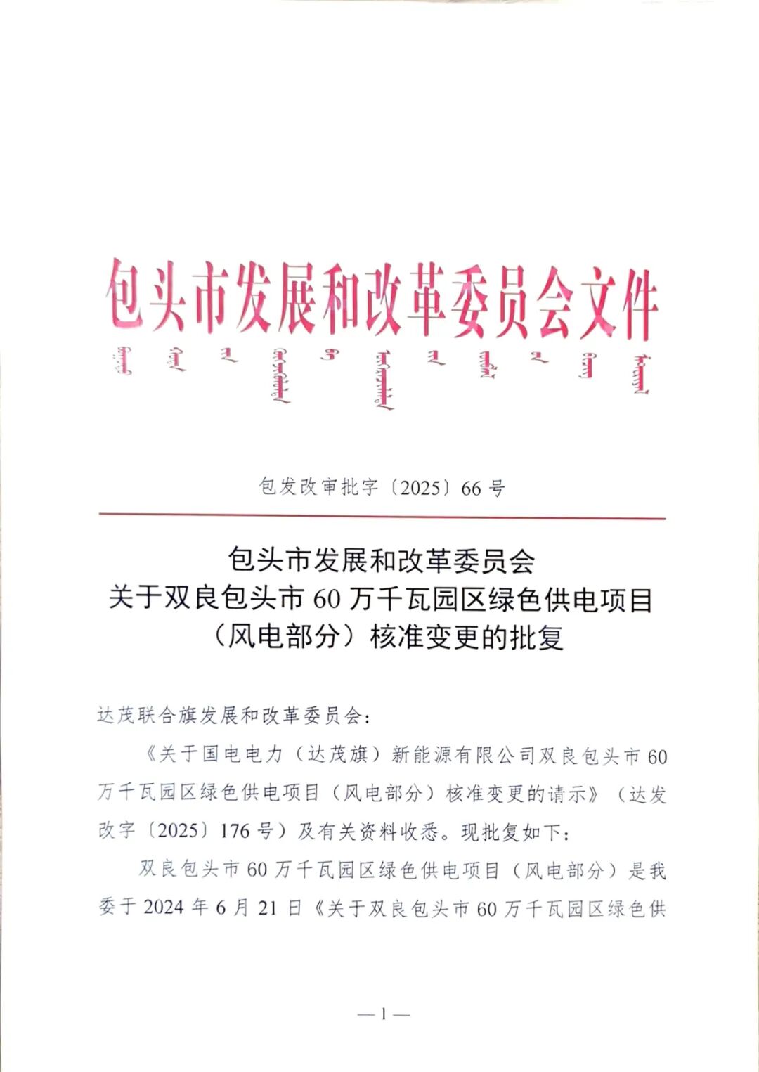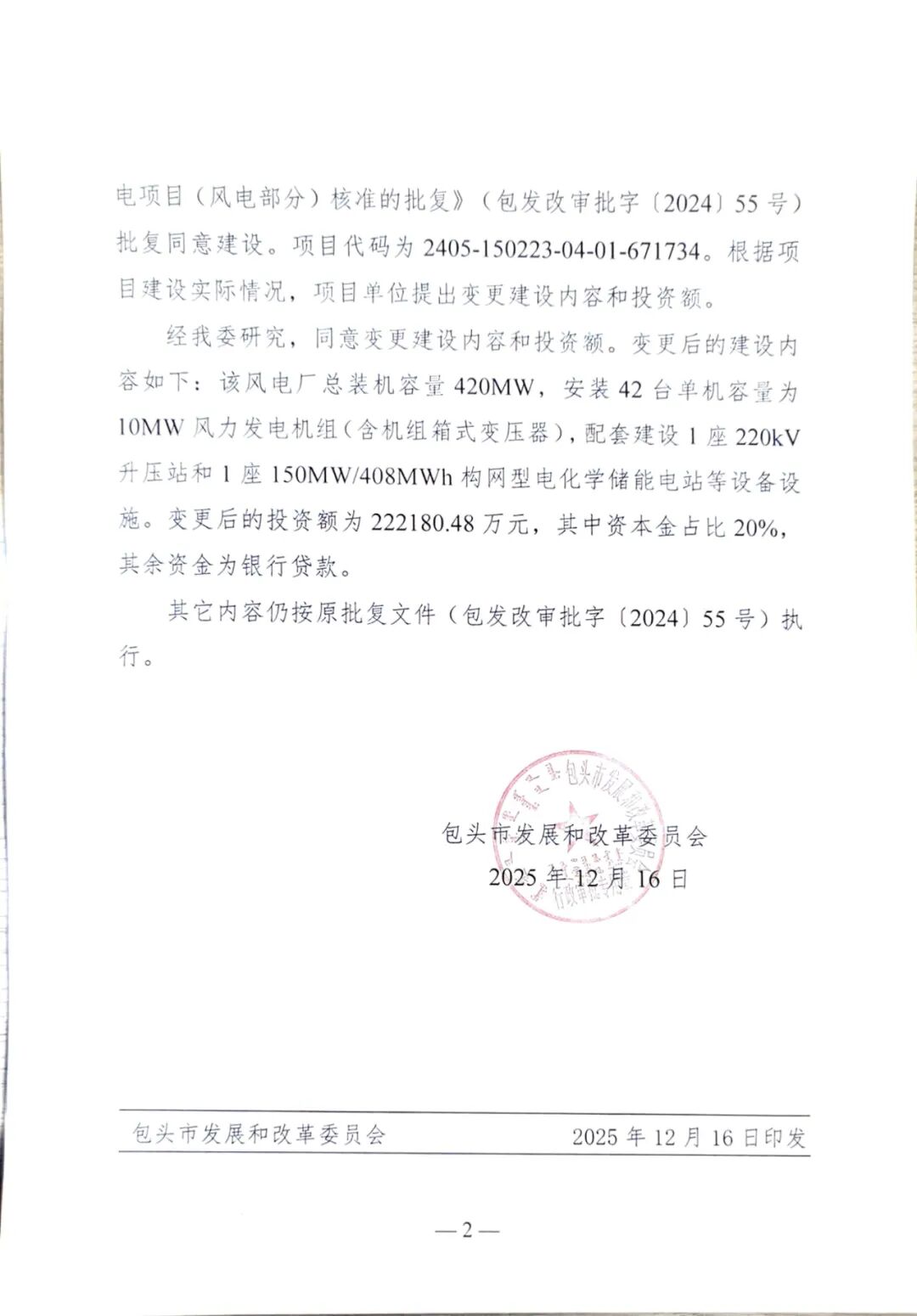 据悉,双良包头市60万千瓦园区绿色供电项目(风电部分)建设地点为包头市达茂旗,项目单位为国电电力(达茂旗)新能源有限公司。变更后的建设内容如下:该风电厂总装机容量420MW,安装42台单机容量为10MW风力发电机组(含机组箱式变压器),配套建设1座220kV升压站和1座150MW/408MWh构网型电化学储能电站等设备设施。变更后的投资额为222180.48万元,其中资本金占比 20%,其余资金为银行贷款。
