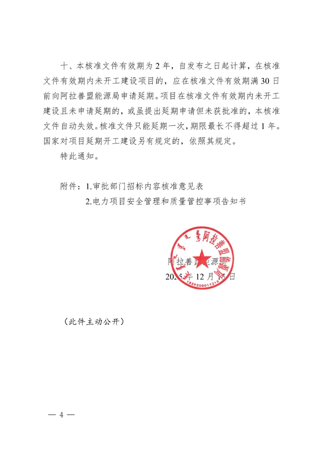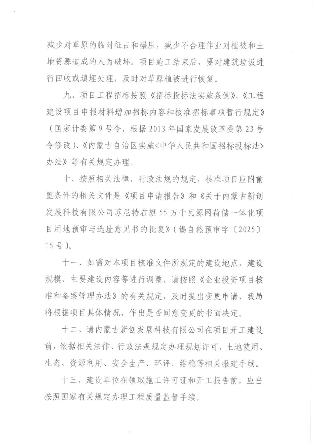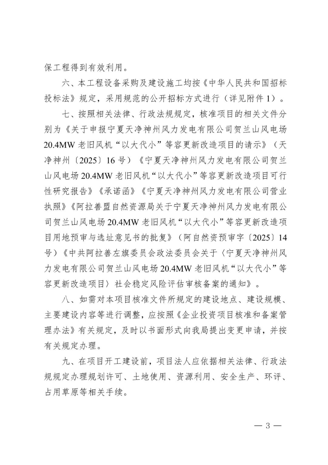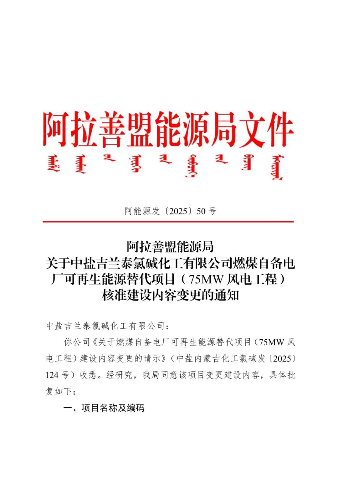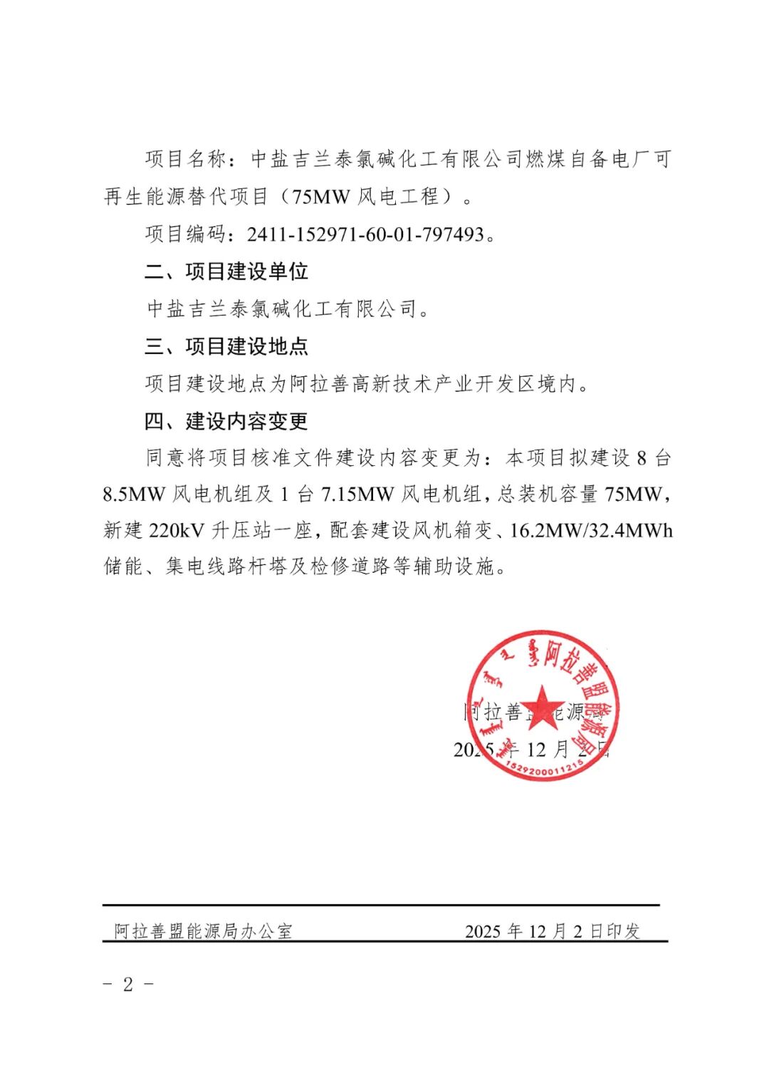 中盐吉兰泰氯碱化工有限公司燃煤自备电厂可再生能源替代项目(75MW风电工程)建设地点为阿拉善高新技术产业开发区境内,建设单位为中盐吉兰泰氯碱化工有限公司,同意将项目核准文件建设内容变更为:本项目拟建设8台8.5MW风电机组及1台7.15MW风电机组,总装机容量75MW,新建220kV升压站一座,配套建设风机箱变、16.2MW/32.4MWh储能、集电线路杆塔及检修道路等辅助设施。