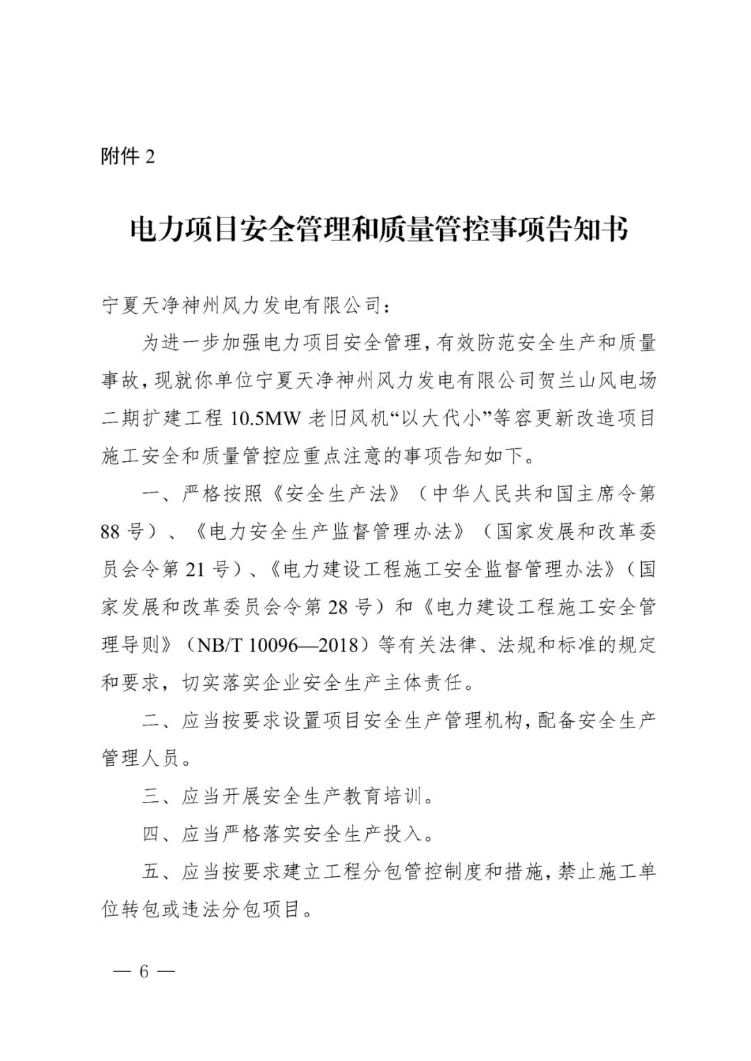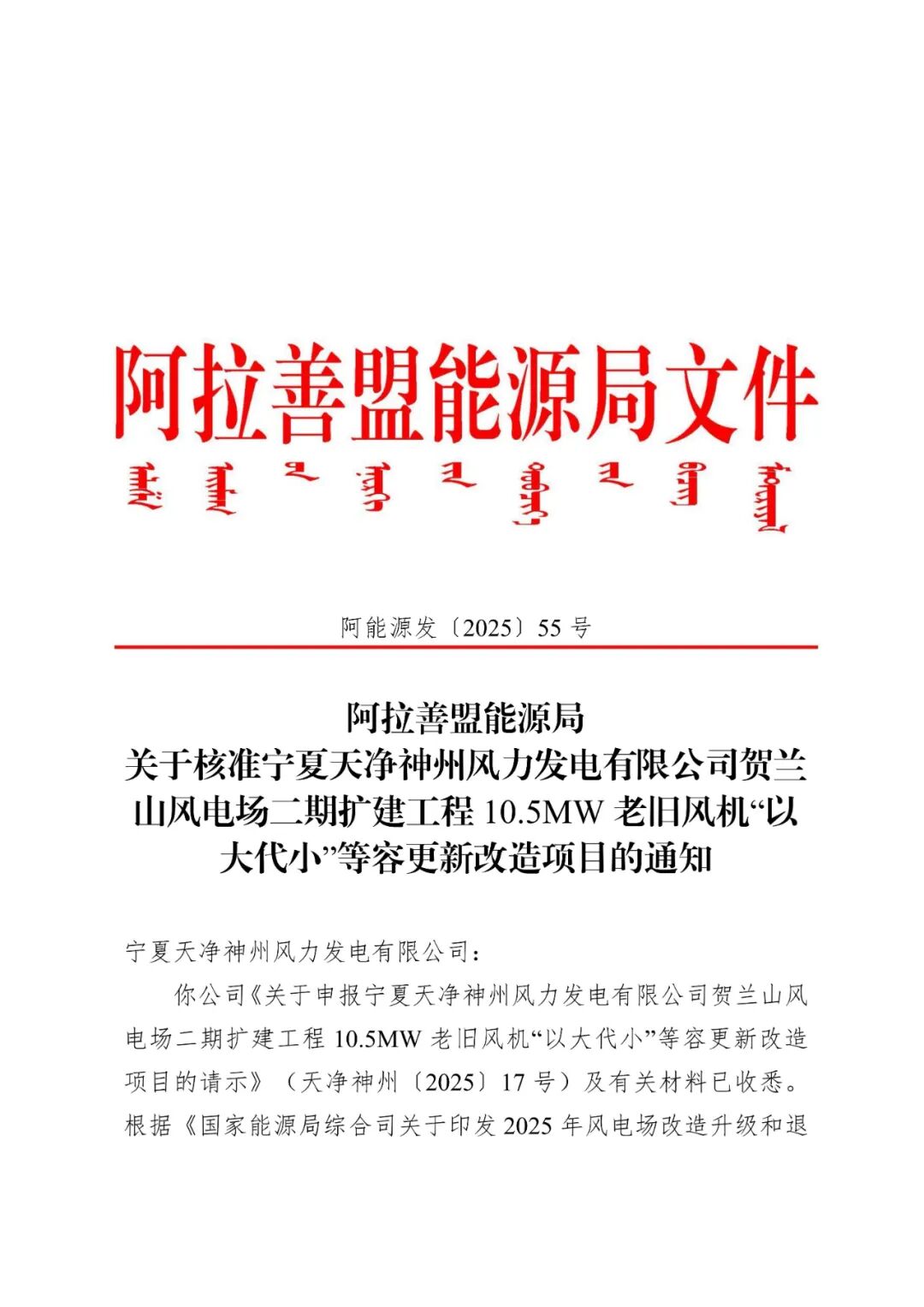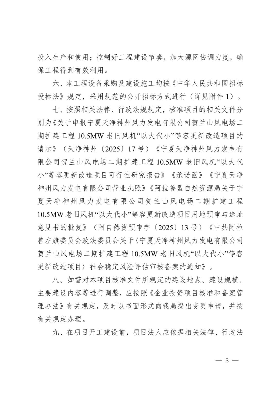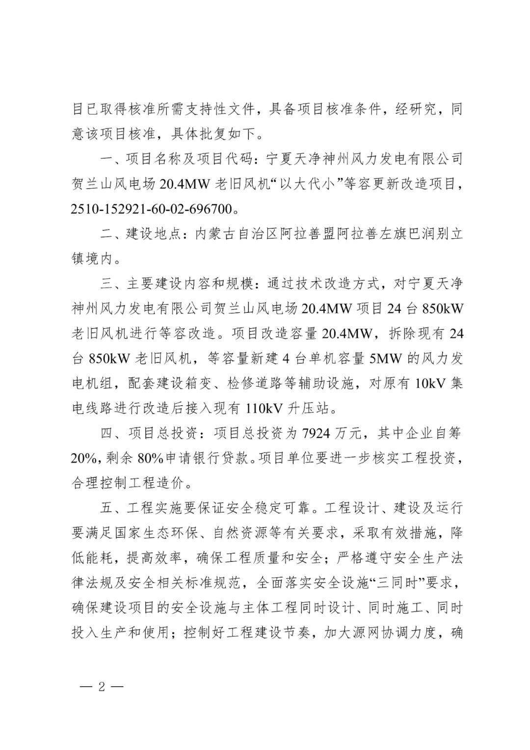 宁夏天净神州风力发电有限公司贺兰山风电场二期扩建工程10.5MW老旧风机“以大代小”等容更新改造项目位于内蒙古自治区阿拉善盟阿拉善左旗巴润别立镇境内,项目单位为宁夏天净神州风力发电有限公司,通过技术改造方式,对宁夏天净神州风力发电有限公司贺兰山风电场二期扩建工程10.5MW项目7台1500kW老旧风机进行等容改造。项目改造容量10.5MW,拆除现有7台1500kW老旧风机,等容量新建2台单机容量5MW的风力发电机组,配套建设箱变、检修道路等辅助设施,对原有10kV集电线路进行改造后接入现有110kV升压站。项目总投资为4418万元。