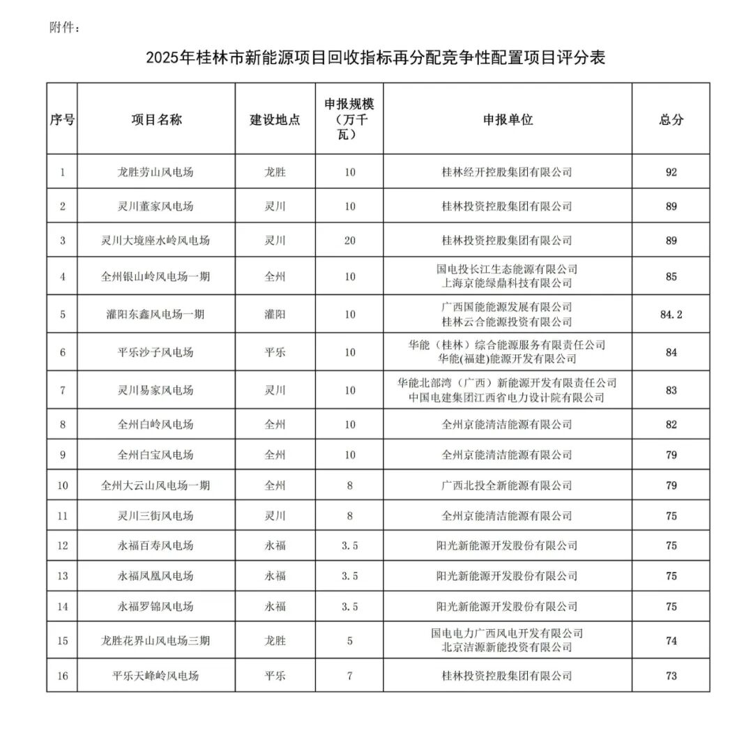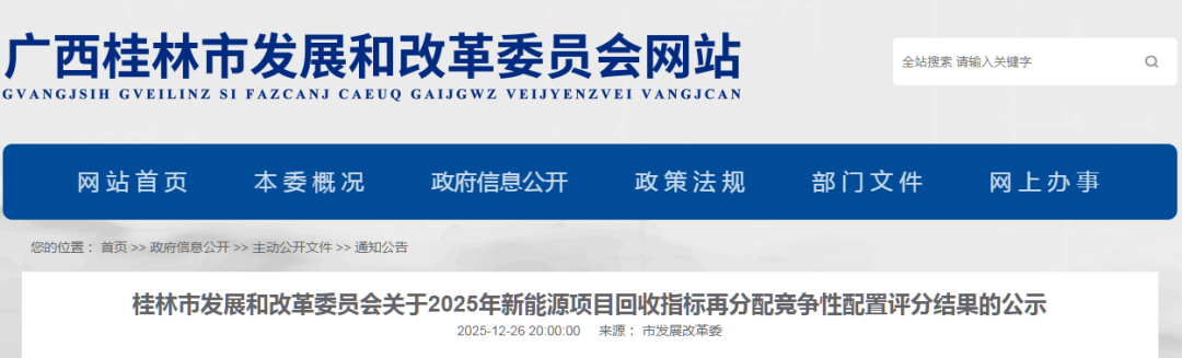 12月26日,广西桂林市发改委公示关于2025年新能源项目回收指标再分配竞争性配置评分结果。
